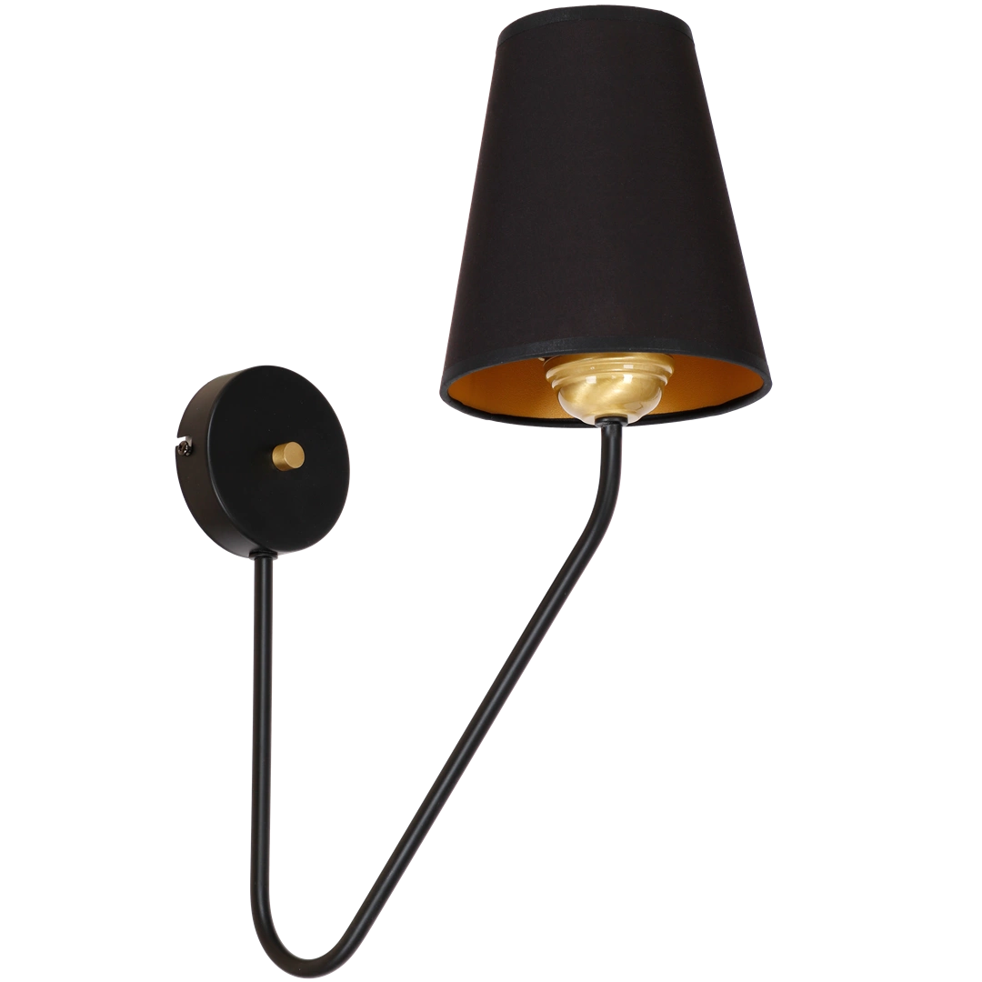 VICTORIA MLP4911 to lampa ścienna z jednym źródłem światła. Korpus lampy został wykonany z wysokiej jakości metalu w kolorze czarnym. Lampa posiada klosz w formie trapezu osadzony na stylowo wygiętym ramieniu przytwierdzonym do podstawy. Abażur jest z tkaniny w kolorze czarnym na zewnątrz, od środka jest złoty. Kinkiet będzie idealnym wyborem do klasycznych wnętrz. Idealnie wkomponuje się do: salonu, sypialni, jadalni, pokoju młodzieżowego, lokalu, korytarza. Wysokość lampy to: 50 cm, szerokość 15 cm, głębokość 34 cm. Klosz ma wysokość 18 cm. Źródłem światła jest żarówka typu E27 o mocy max 60W w ilości 1 szt.