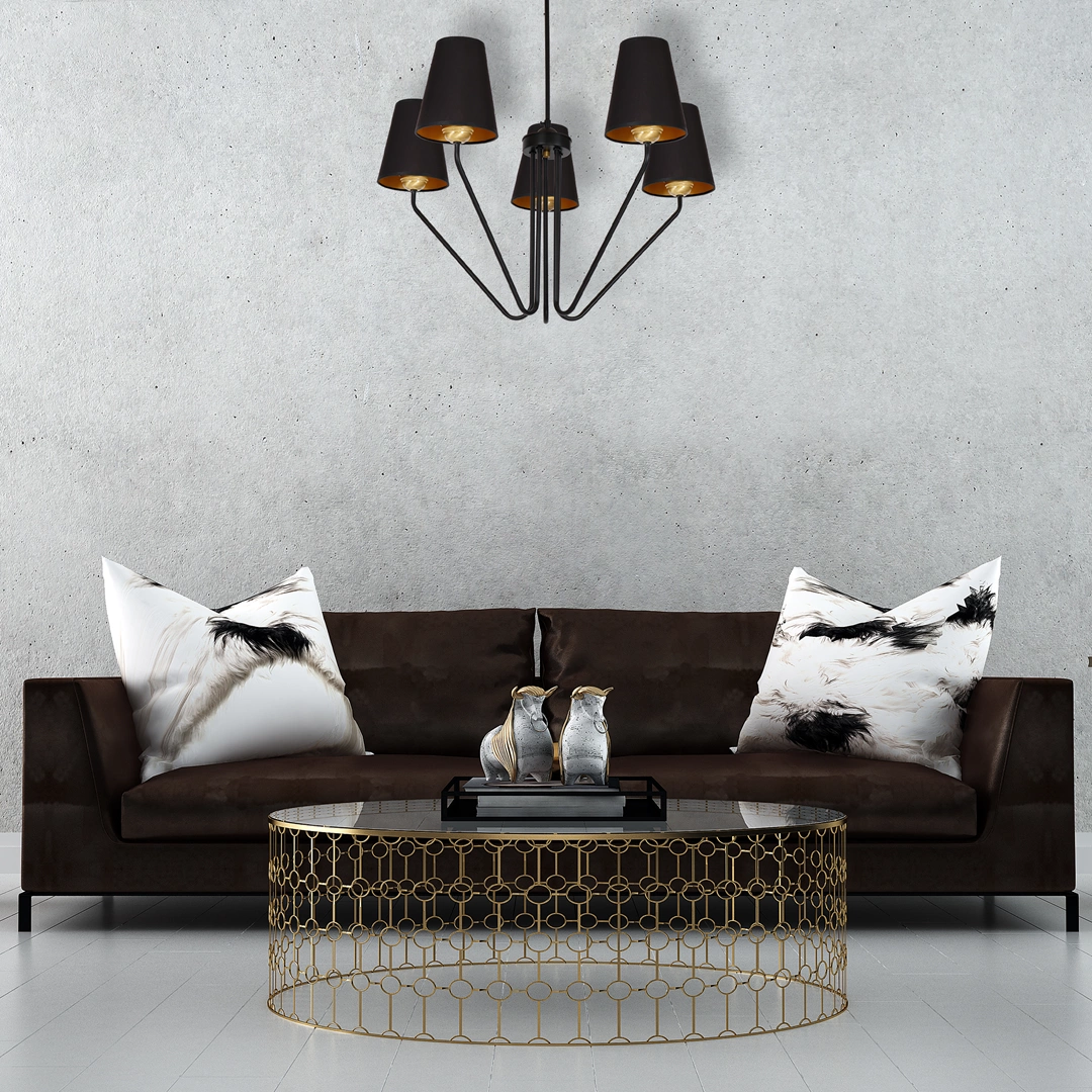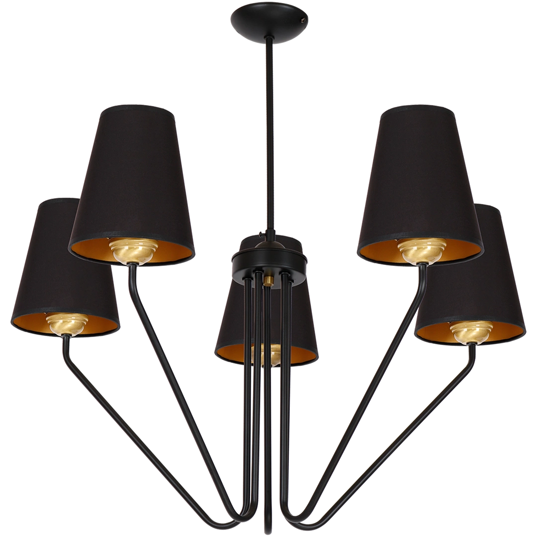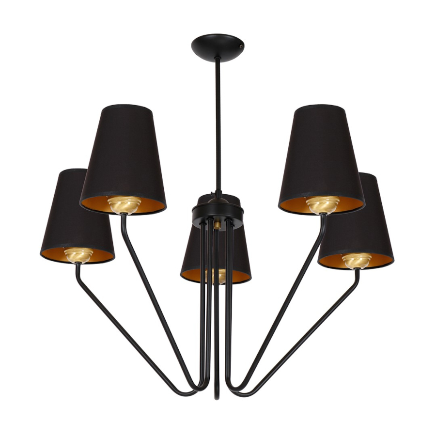 VICTORIA MLP4913 to lampa sufitowa z pięcioma źródłami światła. Korpus lampy został wykonany z wysokiej jakości metalu w kolorze czarnym. Lampa posiada pięć kloszy w formie trapezu osadzonych na stylowo wygiętych ramionach. Abażury są z tkaniny w kolorze czarnym na zewnątrz, od środka są złote. Żyrandol będzie idealnym wyborem do klasycznych wnętrz. Idealnie wkomponuje się do: salonu, sypialni, jadalni, pokoju młodzieżowego, lokalu. Wysokość lampy to: 73 cm, szerokość 72 cm, głębokość 72 cm. Klosz ma wysokość 18 cm. Źródłem światła jest żarówka typu E27 o mocy max 60W w ilości 5 szt.