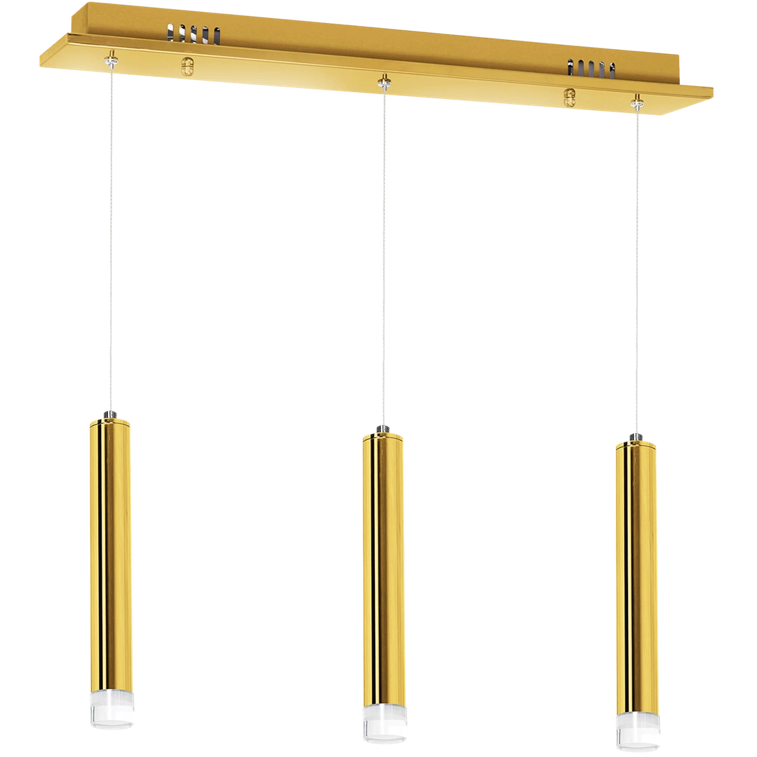 GOLDIE ML5714 to nowoczesna lampa wisząca z trzema źródłami światła. Wykonana została z wysokiej jakości metalu w kolorze złotym i akrylu. Lampa posiada trzy zwisające smukłe klosze w kształcie tuby przypominające sople. Będzie idealnym wyborem do nowoczesnych oraz loftowych wnętrz. Doskonale będzie się prezentować w każdym pomieszczeniu. Dużą zaletą lampy jest możliwość regulacji wysokości. Wysokość maksymalna lampy to: 90 cm, szerokość 45 cm, głębokość 9 cm. Klosz ma wysokość 28 cm i średnicę 3,5 cm. Źródłem światła są 3 wbudowane moduły LED 5W. Łączna moc to 15W LED 1050lm 4000K. Źródło światła jest wymienne.