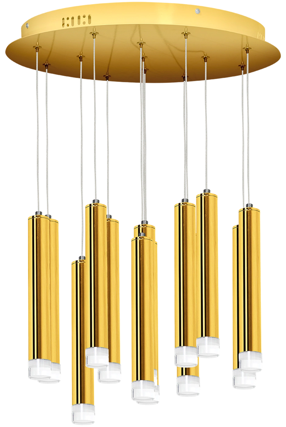 GOLDIE ML5716 to nowoczesna lampa wisząca z dwunastoma źródłami światła. Wykonana została z wysokiej jakości metalu w kolorze złotym i akrylu. Lampa posiada dwanaście zwisających smukłych kloszy w kształcie tuby przypominających sople. Będzie idealnym wyborem do nowoczesnych oraz loftowych wnętrz. Doskonale będzie się prezentować w każdym pomieszczeniu. Dużą zaletą lampy jest możliwość regulacji wysokości. Wysokość maksymalna lampy to: 90 cm, szerokość 45 cm, głębokość 45 cm. Klosz ma średnicę 2,5 cm. Źródłem światła jest 12 wbudowanych modułów LED 1W. Łączna moc to 12W LED 840lm 4000K. Źródło światła jest wymienne.