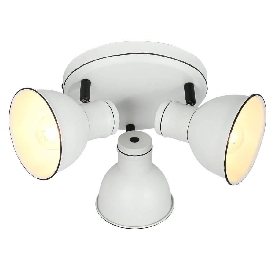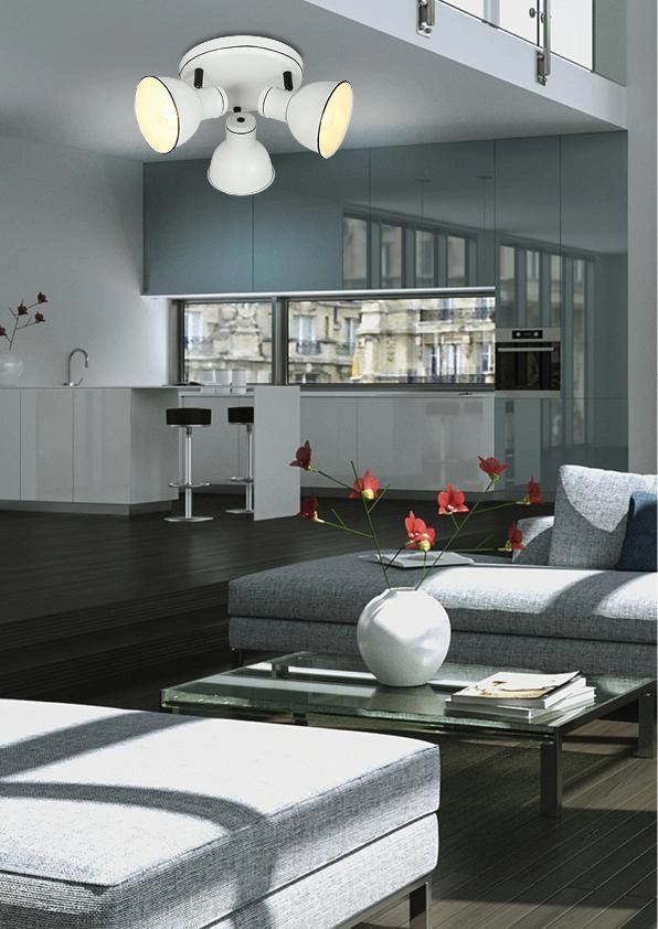 ZUMBA 98-72160 to nowoczesna lampa sufitowa z trzema źródłami światła. Wykonana została z metalu w kolorze biało-czarnym. Lampa posiada trzy klosze osadzone na ruchomych przegubach, które dają możliwość regulacji kąta padania światła. Oprawa będzie idealnym wyborem do klasycznych oraz nowoczesnych wnętrz. Doskonale będzie się prezentować w: salonie, jadalni, sypialni, pokoju młodzieżowym, gabinecie, biurze, lokalu, przedpokoju, korytarzu. Wysokość lampy to: 20 cm, szerokość 33 cm, głębokość 33 cm. Źródłem światła jest żarówka typu E14 o mocy max 40W w ilości 3 szt.