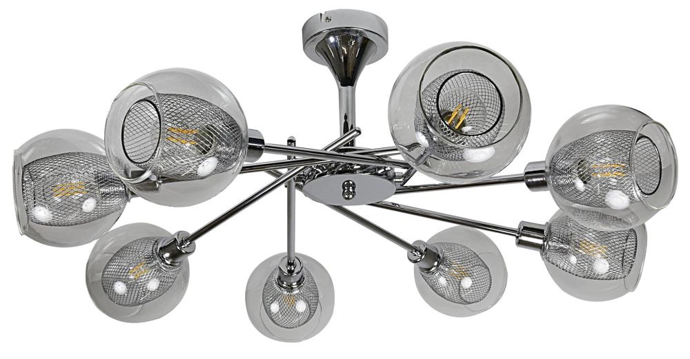 OZZO 38-72283 to nowoczesna lampa sufitowa z ośmioma źródłami światła. Wykonana została z wysokiej jakości metalu w kolorze chromowym. Lampa posiada szklane transparentne klosze wewnątrz których osadzono metalowe koszyczki. Dodatkowym atutem są obrotowe ramiona, które pozwalają na zmianę położenia kloszy. Oprawa będzie idealnym wyborem do wnętrz urządzonych w nowoczesnym stylu. Doskonale będzie się prezentować w: salonie, sypialni, jadalni, pokoju młodzieżowym, gabinecie, biurze, lokalu, kuchni, przedpokoju, korytarzu. Wysokość lampy to: 32 cm, szerokość 68 cm, głębokość 68 cm. Źródłem światła jest żarówka typu E14 o mocy max 40W w ilości 8 szt.