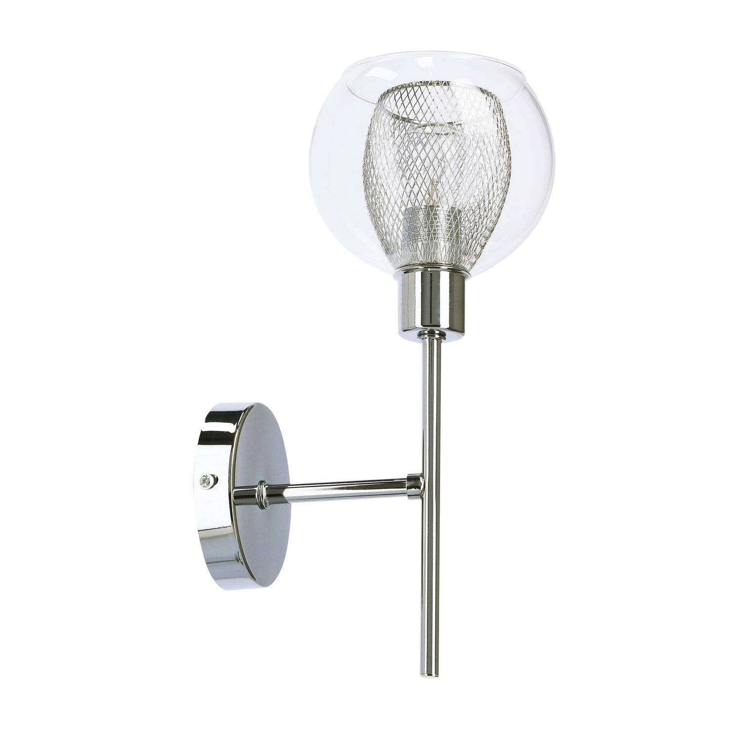 OZZO 21-72184 to nowoczesna lampa ścienna z jednym źródłem światła. Wykonana została z wysokiej jakości metalu w kolorze chromowym. Lampa posiada szklany transparentny klosz z metalowym koszyczkiem wewnątrz. Kinkiet będzie idealnym wyborem do wnętrz urządzonych w nowoczesnym stylu. Doskonale będzie się prezentować w: salonie, sypialni, jadalni, pokoju młodzieżowym, gabinecie, biurze, lokalu, przedpokoju, korytarzu. Wysokość lampy to: 28 cm, szerokość 12 cm, głębokość 17 cm. Źródłem światła jest żarówka typu E14 o mocy max 40W w ilości 1 szt.