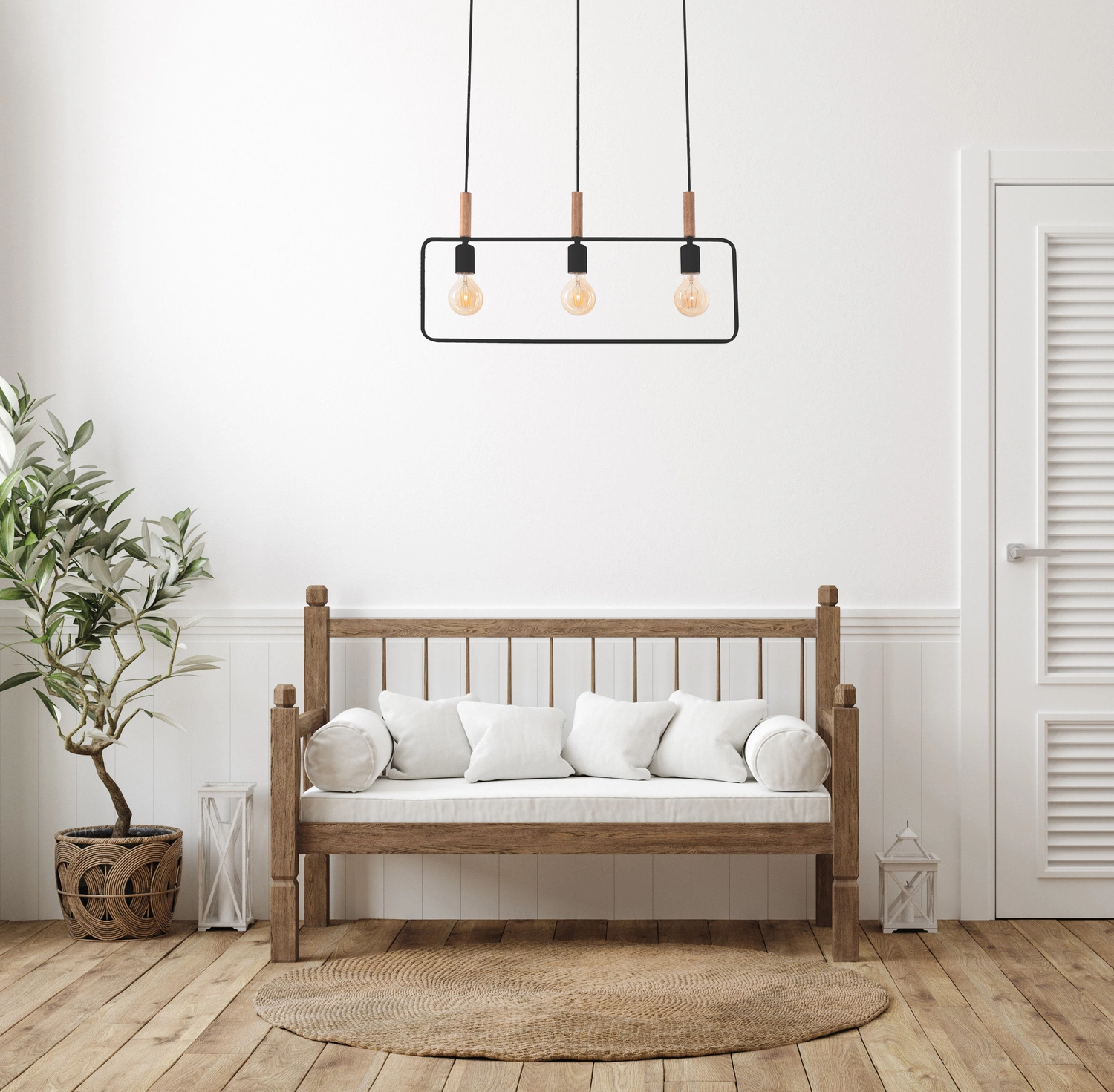 FRAME 33-73525 to nowoczesna lampa wisząca z trzema źródłami światła. Wykonana została z wysokiej jakości stali w kolorze czarnym i drewna. Klosz lampy stanowi prostokątna ramka wewnątrz której osadzono oprawki żarówek. Kształt klosza sprawia, że odsłonięte żarówki są elementem ozdobnym lampy dlatego warto wybrać ich dekoracyjny model. Lampa będzie idealnym wyborem do nowoczesnych wnętrz. Doskonale wpasuje się do: jadalni, salonu, sypialni, pokoju młodzieżowego, gabinetu, lokalu, kuchni. Dużym atutem jest możliwość regulacji wysokości. Wysokość maksymalna to: 110 cm, szerokość 70 cm, głębokość 6 cm. Źródłem światła jest żarówka typu E27 o mocy max 60W w ilości 3 szt.
