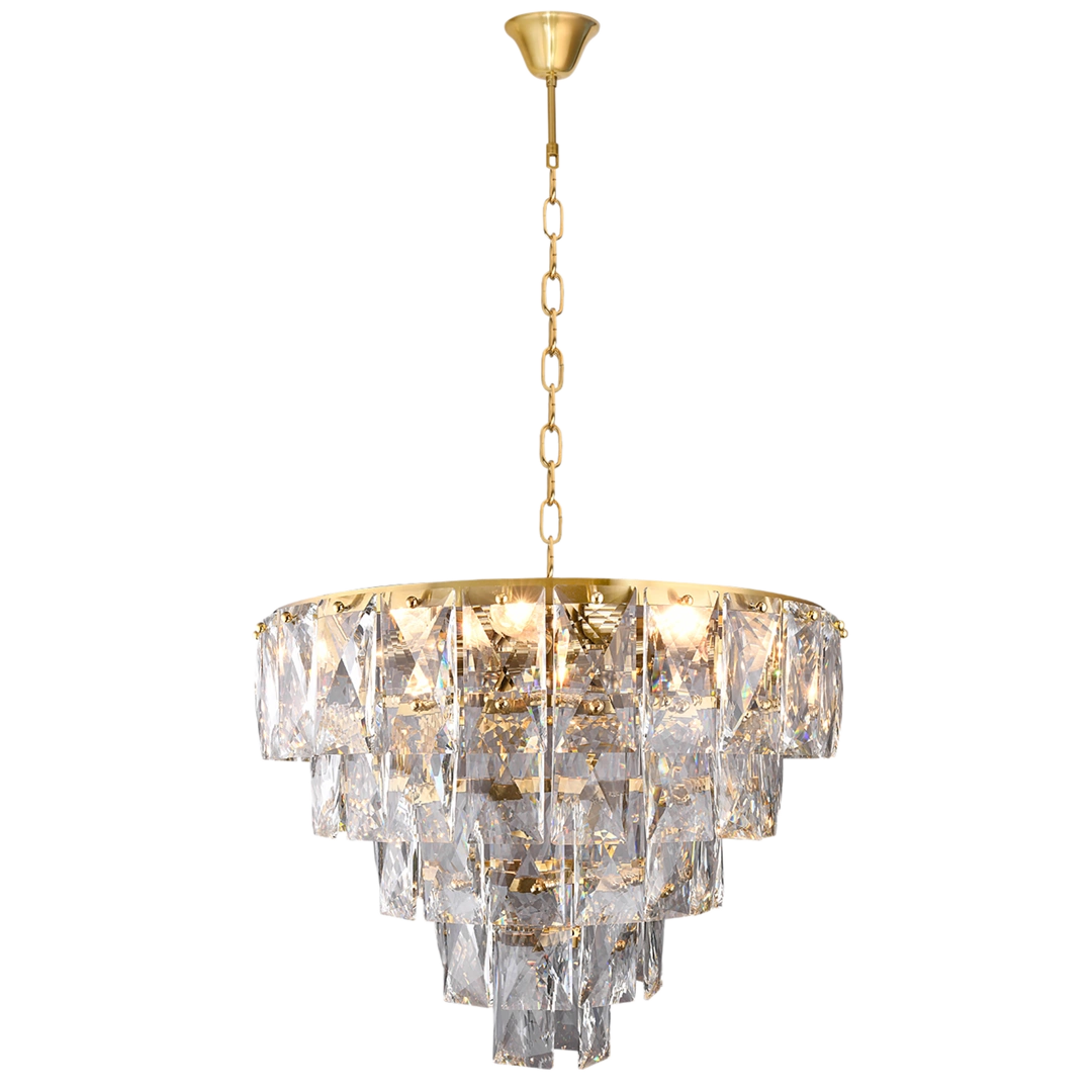 CHELSEA ML6002 to stylowa lampa wisząca z sześcioma źródłami światła. Klosz lampy stanowią kryształy osadzone na metalowym stelażu, które niesamowicie rozpraszają światło. Stelaż jest w złotym kolorze. Bardzo elegancki wygląd sprawia, że lampa będzie idealnym wyborem do wnętrz nowoczesnych, klasycznych oraz glamour. Doskonale wkomponuje się do: salonu, sypialni, jadalni, lokalu. Żyrandol posiada możliwość regulacji wysokości. Wysokość maksymalna lampy to: 100 cm, szerokość 50 cm, głębokość 50 cm. Klosz ma wysokość 40 cm i średnicę 50 cm. Źródłem światła jest żarówka typu E14 o mocy max 40W w ilości 6 szt.