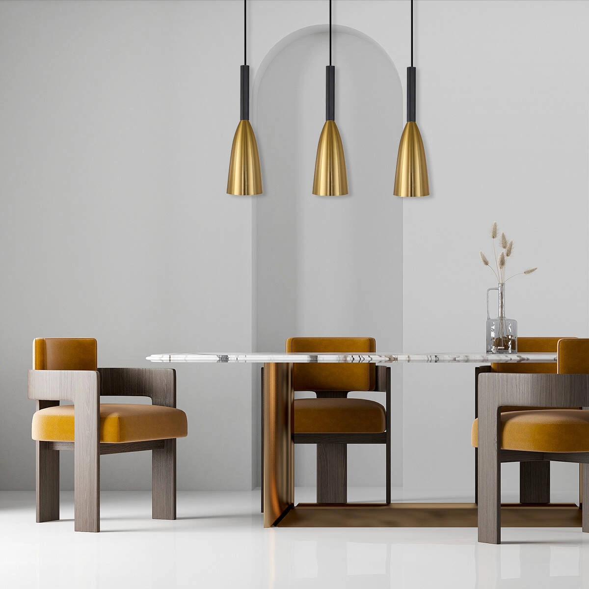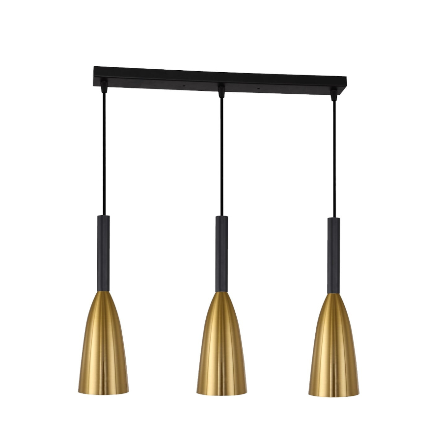 SOLIN LP-181/3L GD to stylowa lampa wisząca z trzema źródłami światła. Wykonana została z wysokiej jakości metalu. Zawiesie jest w kolorze czarnym, klosze są złote. Oprawa będzie idealnym wyborem do wnętrz urządzonych w nowoczesnym stylu. Doskonale będzie się prezentować w: salonie, jadalni, sypialni, pokoju młodzieżowym, gabinecie, lokalu, kuchni. Dużym atutem jest możliwość regulacji wysokości. Wysokość maksymalna lampy to: 100 cm, szerokość 50 cm, głębokość 11 cm. Źródłem światła jest żarówka typu E27 o mocy max 60W w ilości 3 szt.
