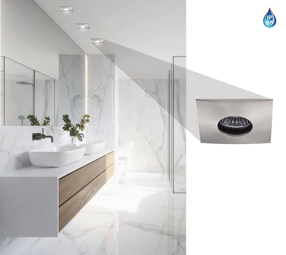 Oprawa do wbudowywania w każdy rodzaj sufitu podwieszanego oraz inne zabudowy. Wysoka szczelność IP65 oraz zasilanie napięciem 12V, pozwala na montaż w łazienkach w obszarach I strefy użytkowania (obszar nad wanną, brodzikiem lub wewnątrz pryszniców). Kwadratowy kształt, solidna konstrukcja oraz galwaniczne lub malowane proszkowo (model w białym kolorze) wykończenie czynią jedyną w swoim rodzaju oprawę dedykowaną do łazienek.