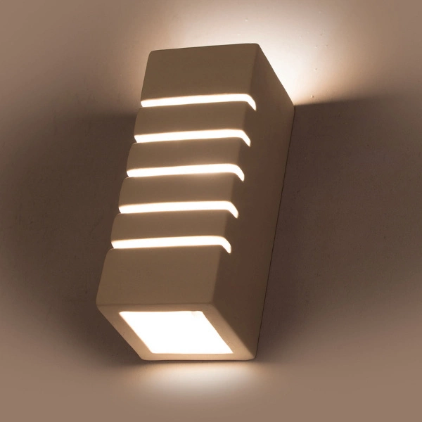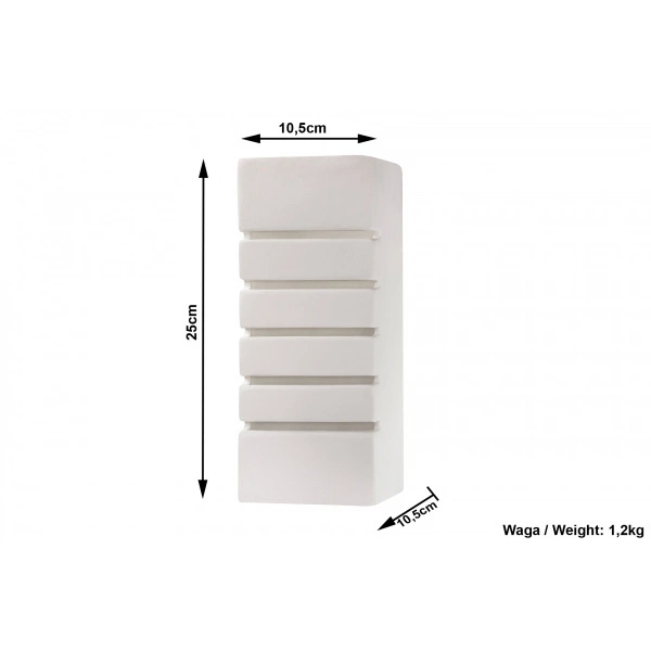 SAMIR SL.0161 to nowoczesna lampa ścienna z jednym źródłem światła. Wykonana została z wypalanej ceramiki w kolorze białym (może być malowana dowolnymi farbami do ścian). Elementem wyróżniającym kinkietu jest jego oryginalny kształt. Lampa będzie idealnym wyborem do wnętrz urządzonych nowoczesnym stylu. Doskonale będzie się prezentować w: salonie, jadalni, sypialni, pokoju młodzieżowym, gabinecie, biurze, lokalu, korytarzu, przedpokoju. Wysokość kinkietu to: 26 cm, szerokość 10,5 cm, głębokość 10,5 cm. Źródłem światła jest żarówka typu E27 o mocy max 15W LED w ilości 1 szt.