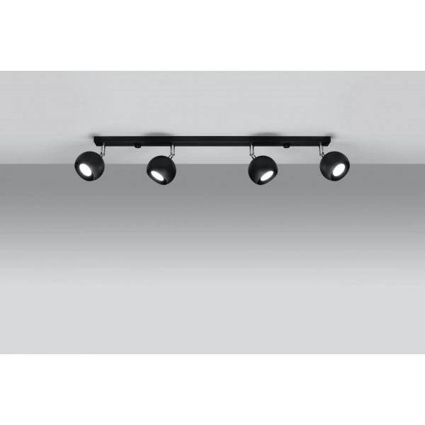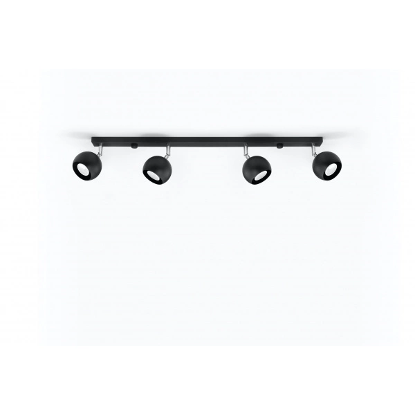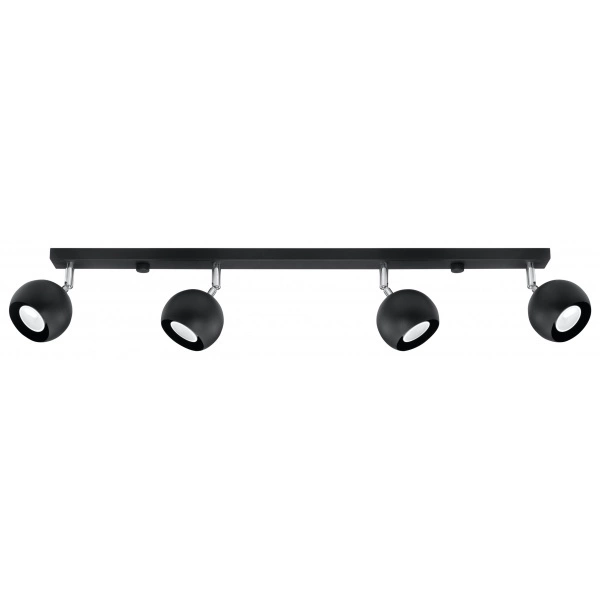OCULARE 4L SL.0447 to nowoczesna lampa sufitowa z czterema źródłami światła. Wykonana została z wysokiej jakości metalu w kolorze czarnym. Lampa składa się z podłużnej podsufitki z krótkimi ramionami, na których osadzono cztery reflektorki w kształcie ściętych kul. Reflektorki mają możliwość regulacji punktu padania światła. Lampa będzie idealnym wyborem do nowoczesnych wnętrz. Doskonale będzie się prezentować w: salonie, jadalni, sypialni, pokoju młodzieżowym, gabinecie, biurze, przedpokoju, korytarzu. Wysokość lampy to: 15 cm, szerokość 80 cm, głębokość 10 cm. Źródłem światła jest żarówka typu GU10 o mocy max 40W w ilości 4 szt.