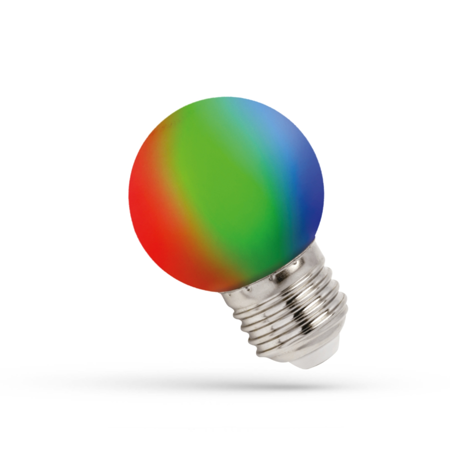 Żarówka kulka emitująca kolory w palecie barw RGB bez możliwości sterowania.