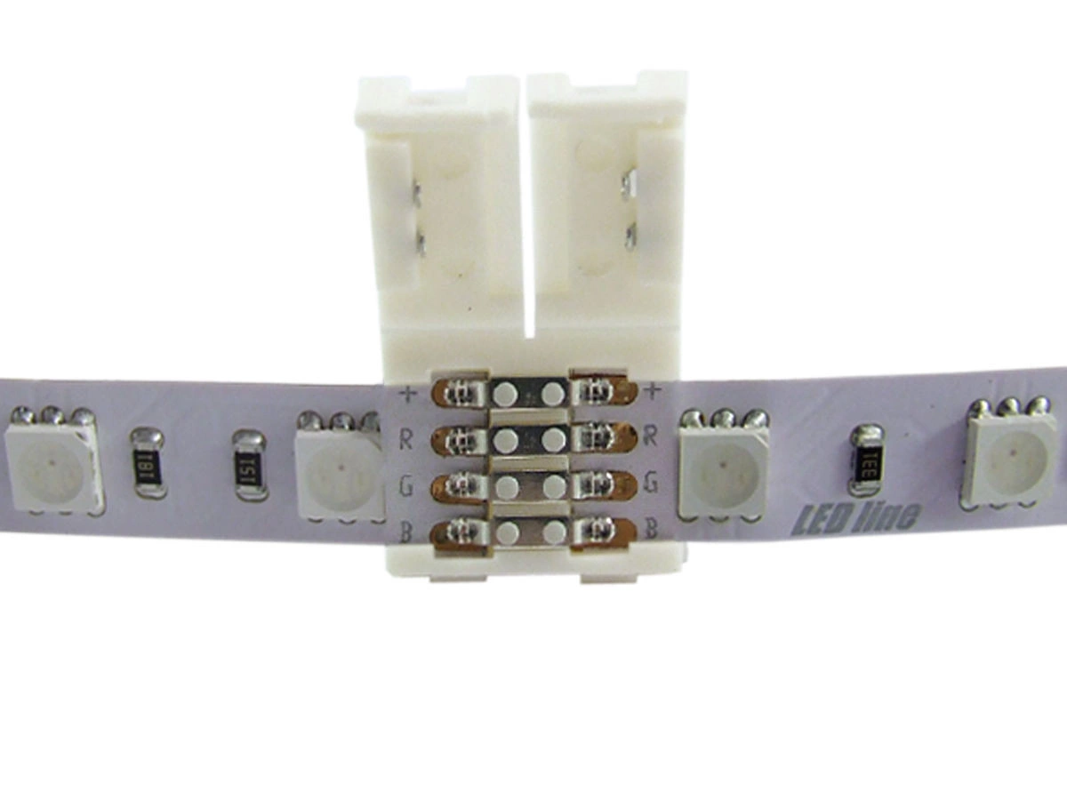 Złączka przystosowana jest do zasilania każdej taśmy LED RGB o szerokości laminatu 10 mm. Wystarczy umieścić taśmę w złączce i zacisnąć. Stosując naszą złączkę unikniecie Państwo uciążliwego lutowania, które często jest dodatkowym utrudnieniem w montażu oświetlenia opartego na taśmach LED. Wystarczy zacisnąć taśmę w złączce.
