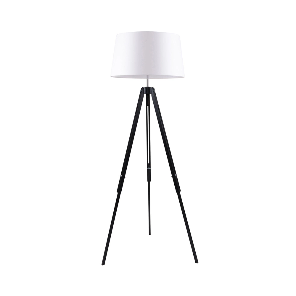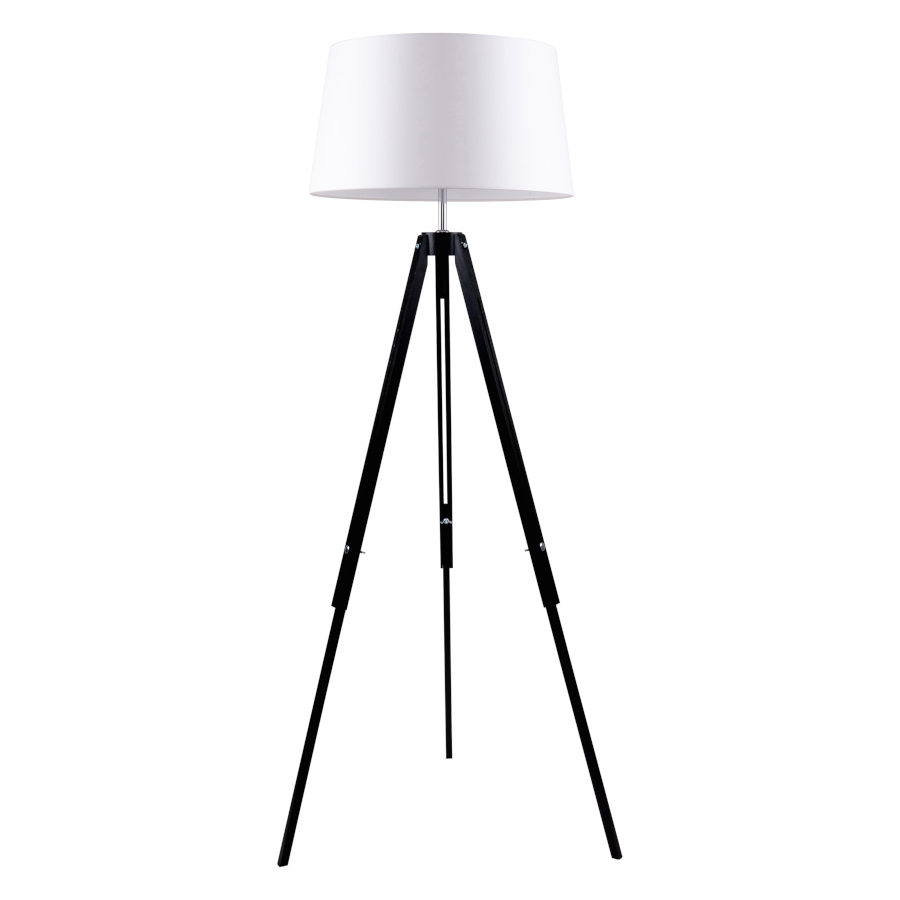 Lampa TRIPOD to 1-punktowa lampa podłogowa o max. mocy 60 W. Konstrukcja lampy umożliwia ustawienie wysokości od 113 do 158 cm, poprzez regulację długości nóg. Drewniany trójnóg został wykonany z drewna bukowego w kolorze czarnym natomiast abażur jest z tkaniny koloru białego. W lampie zastosowano przewód koloru transparetnego.