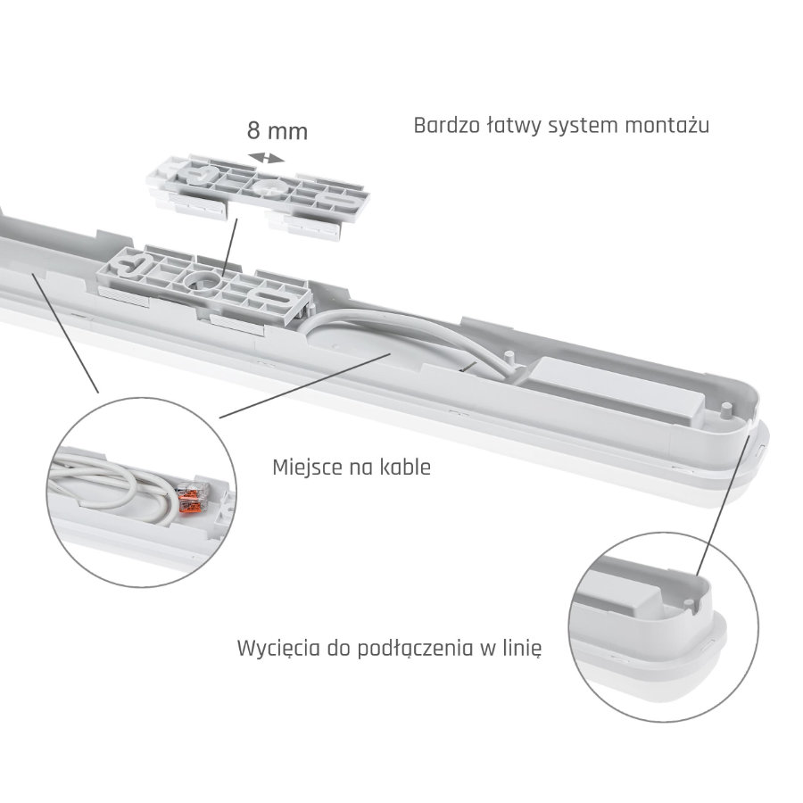 Łatwy dostęp do 2 kostek zasilających bez konieczności otwierania całej oprawy,
