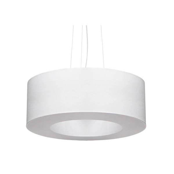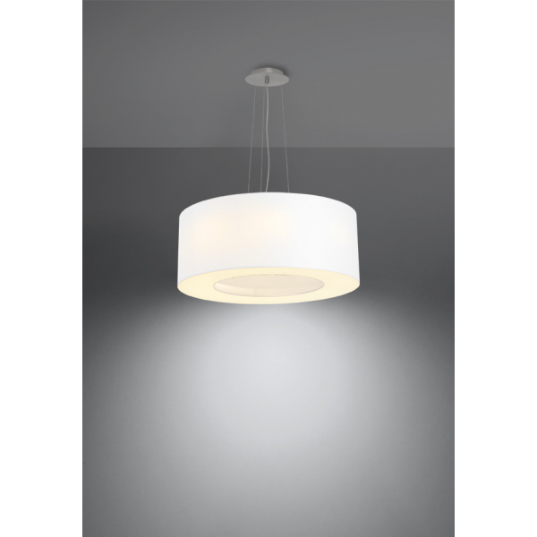 SATURNO SL.0747 to nowoczesna lampa wisząca z pięcioma źródłami światła. Wykonana została z wysokiej jakości tkaniny, stali oraz PVC. Lampa posiada biały abażur w kształcie koła z pustą przestrzenią w środku. Źródła światła są osłonięte białą membraną, która równomiernie rozprasza światło. Oprawa będzie idealnym wyborem do wnętrz urządzonych w nowoczesnym stylu. Doskonale będzie się prezentować w: salonie, jadalni, sypialni, pokoju młodzieżowym, gabinecie, biurze, lokalu, kuchni. Dużą zaletą jest możliwość regulacji wysokości. Wysokość maksymalna lampy to: 110 cm, szerokość 50 cm, głębokość 50 cm. Źródłem światła jest żarówka typu E27 o mocy max 60W w ilości 5 szt.