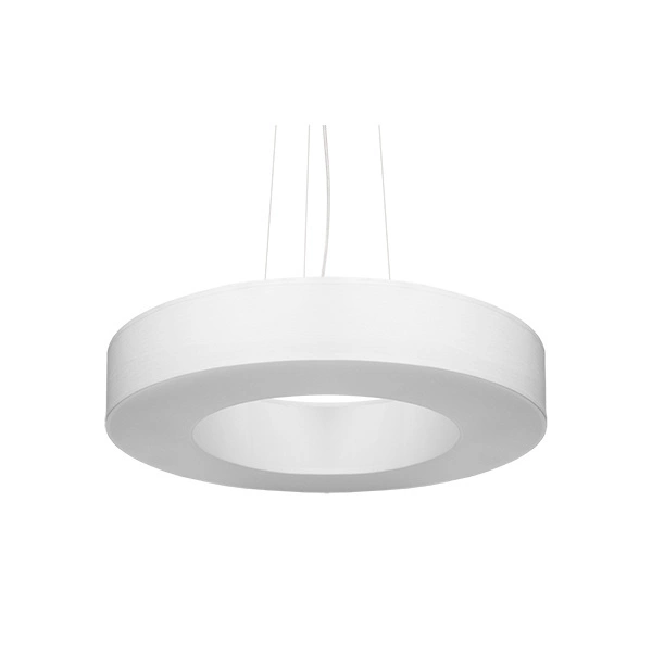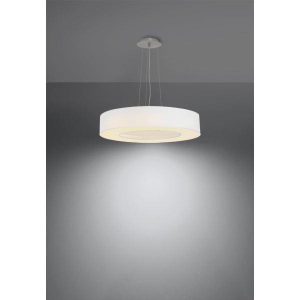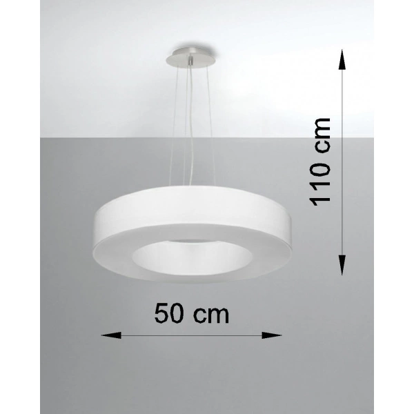SATURNO SLIM SL.0749 to nowoczesna lampa wisząca z pięcioma źródłami światła. Wykonana została z wysokiej jakości tkaniny, stali oraz PVC. Lampa posiada biały abażur w kształcie koła z pustą przestrzenią w środku. Źródła światła są osłonięte białą membraną, która równomiernie rozprasza światło. Oprawa będzie idealnym wyborem do wnętrz urządzonych w nowoczesnym stylu. Doskonale będzie się prezentować w: salonie, jadalni, sypialni, pokoju młodzieżowym, gabinecie, biurze, lokalu, kuchni. Dużą zaletą jest możliwość regulacji wysokości. Wysokość maksymalna lampy to: 110 cm, szerokość 50 cm, głębokość 50 cm. Źródłem światła jest żarówka typu E27 o mocy max 60W w ilości 5 szt.