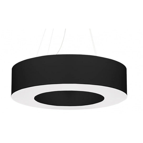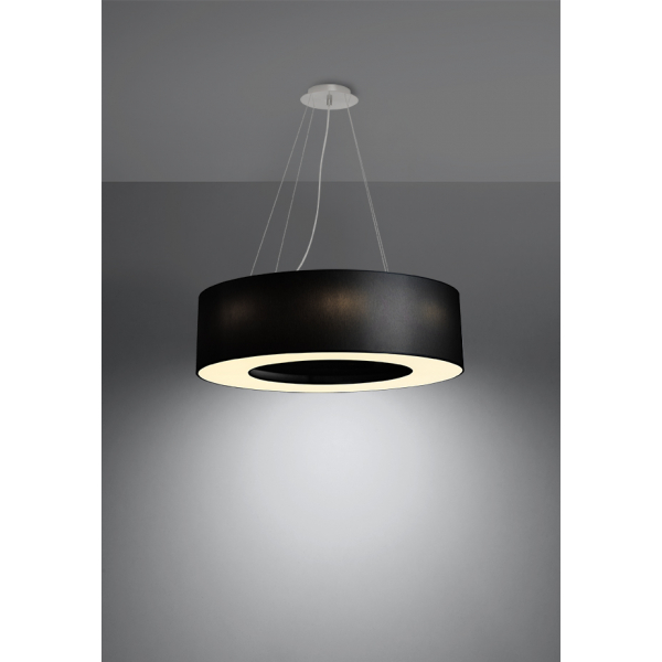 SATURNO SL.0752 to nowoczesna lampa wisząca z sześcioma źródłami światła. Wykonana została z wysokiej jakości tkaniny, stali oraz PVC. Lampa posiada czarny abażur w kształcie koła z pustą przestrzenią w środku. Źródła światła są osłonięte białą membraną, która równomiernie rozprasza światło. Oprawa będzie idealnym wyborem do wnętrz urządzonych w nowoczesnym stylu. Doskonale będzie się prezentować w: salonie, jadalni, sypialni, pokoju młodzieżowym, gabinecie, biurze, lokalu, kuchni. Dużą zaletą jest możliwość regulacji wysokości. Wysokość maksymalna lampy to: 110 cm, szerokość 70 cm, głębokość 70 cm. Źródłem światła jest żarówka typu E27 o mocy max 60W w ilości 6 szt.