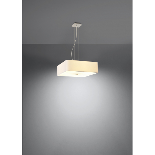 LOKKO SL.0773 to nowoczesna lampa wisząca z pięcioma źródłami światła. Wykonana została z wysokiej jakości tkaniny, stali oraz szkła. Lampa posiada biały abażur w kształcie kwadratu zamknięty od spodu szybą, która równomiernie rozprasza światło. Oprawa będzie idealnym wyborem do wnętrz urządzonych w nowoczesnym oraz minimalistycznym stylu. Doskonale będzie się prezentować w: salonie, jadalni, sypialni, pokoju młodzieżowym, gabinecie, biurze, lokalu, kuchni. Dużą zaletą jest możliwość regulacji wysokości. Wysokość maksymalna lampy to: 110 cm, szerokość 45 cm, głębokość 45 cm. Źródłem światła jest żarówka typu E27 o mocy max 60W w ilości 5 szt.