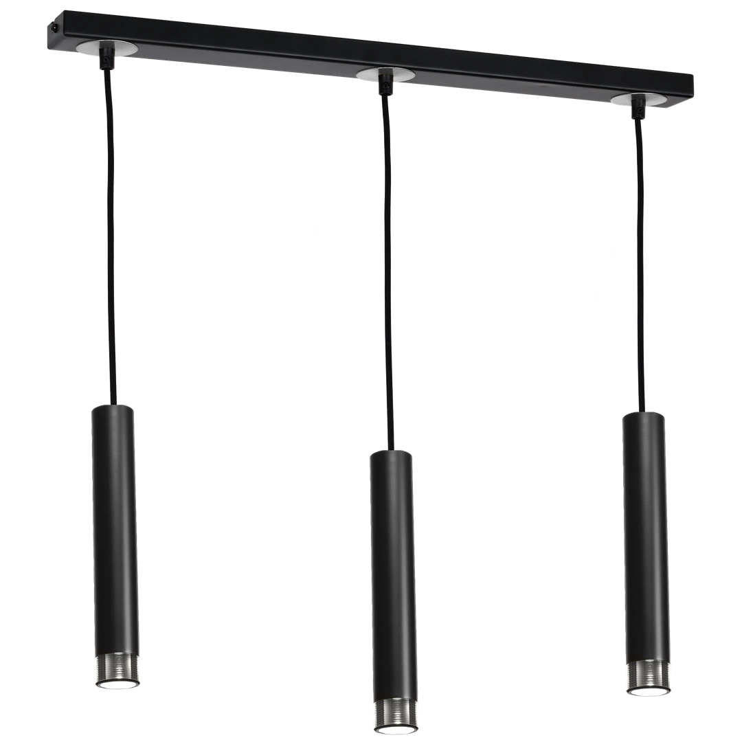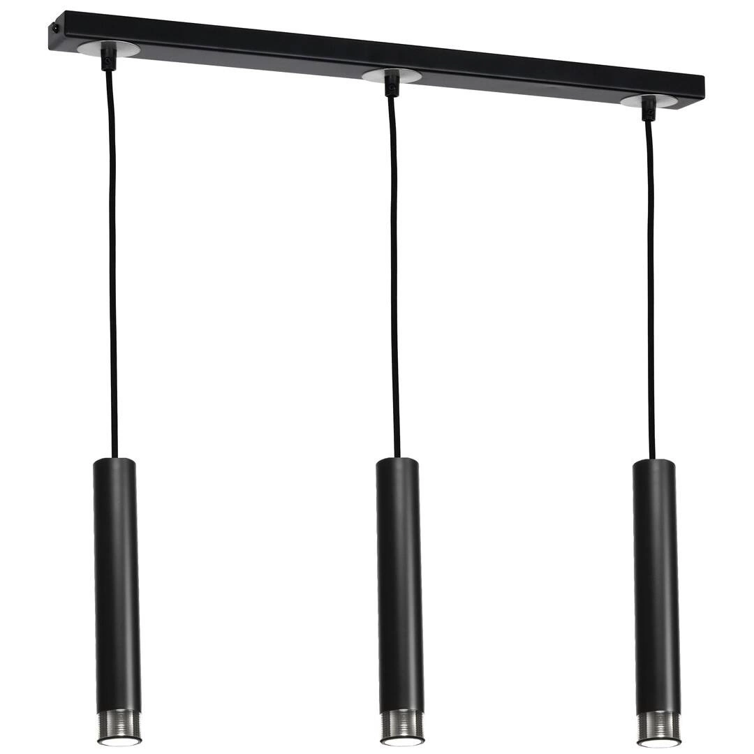 DANI MLP6232 to lampa wisząca w nowoczesnym stylu z trzema źródłami światła. Podsufitkę lampy wykonano z wysokiej jakości metalu w kolorze czarnym z chromowymi wstawkami. Lampa posiada trzy zwisające metalowe czarne klosze w kształcie tuby, których dół wieńczą lśniące obręcze w kolorze chromu. Lampa doskonale wkomponuje się do: salonu, sypialni, pokoju młodzieżowego, gabinetu, lokalu. Dużym atutem jest możliwość regulacji wysokości. Wysokość maksymalna lampy to: 90 cm, szerokość 60 cm, głębokość 6 cm. Klosz ma wysokość 36 cm. Źródłem światła jest żarówka typu GU10 o mocy max 8W w ilości 3 szt.