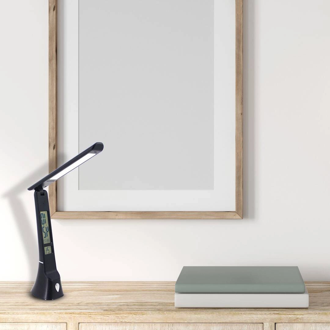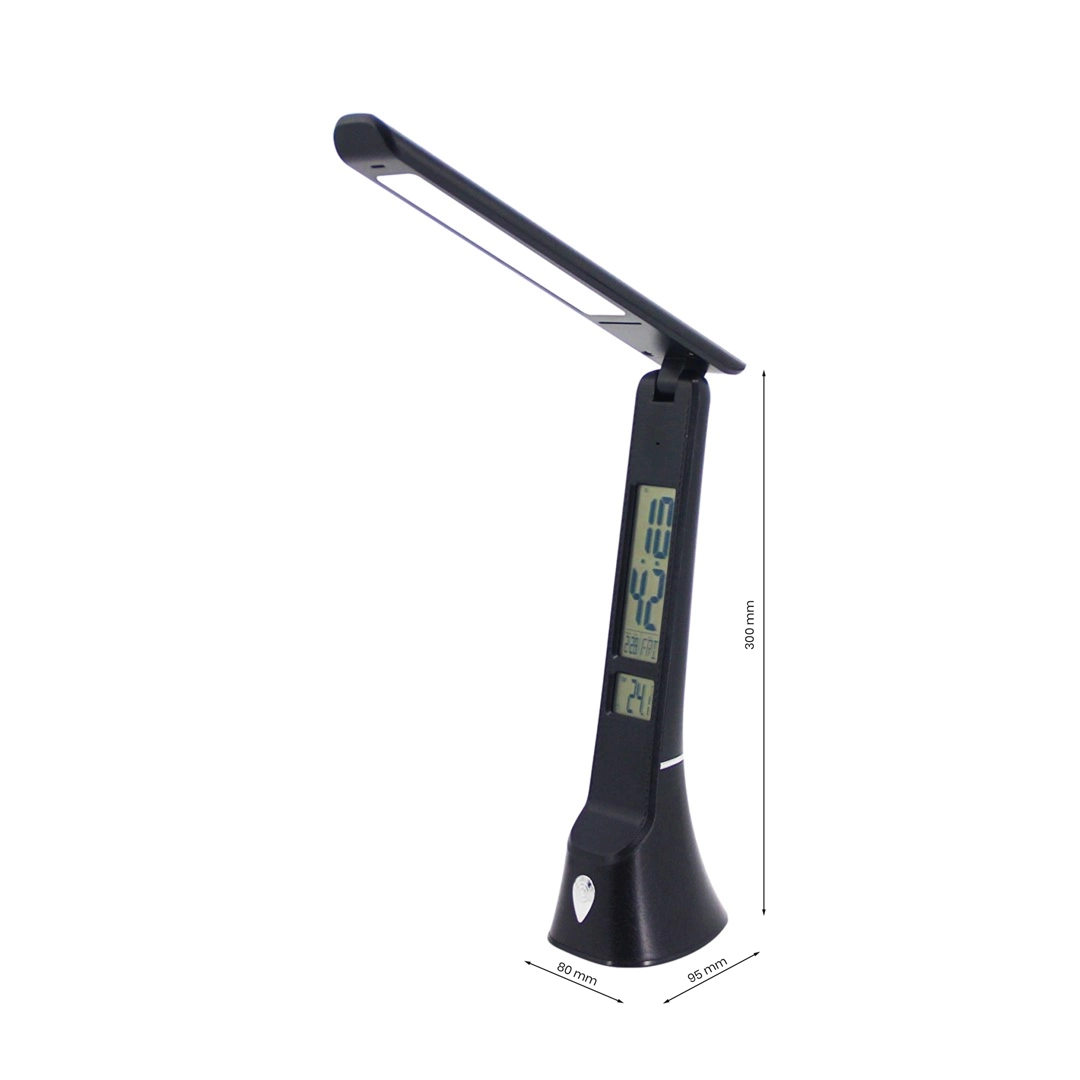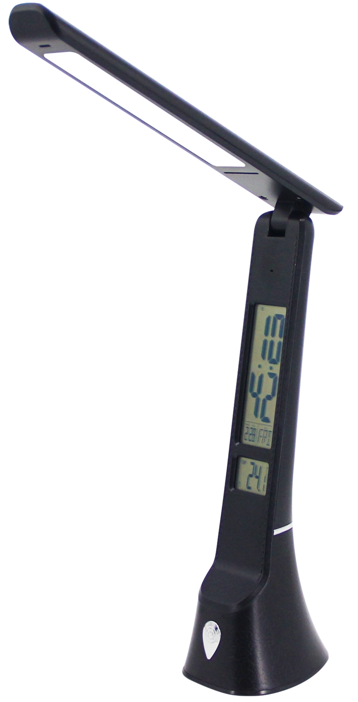 TORI ML6108 to nowoczesna bardzo elegancka lampka biurkowa. Obudowa lampy wykonana jest z tworzywa sztucznego pokrytego czarną ekoskórą. Źródło światła znajduje się na ruchomym ramieniu pozwalającym na odpowiednie ustawienie kierunku padania światła. Dodatkowo na pionowej części podstawy znajdują się dwa elektroniczne wyświetlacze: większy z datownikiem i zegarem, mniejszy ze wskaźnikiem temperatury. Lampa będzie doskonałym wyborem do: gabinetów, biur, sypialni, pokoi młodzieżowych. Dużym atutem lampy jest wbudowany akumulator, dzięki czemu po naładowaniu może działać przez kilka godzin bez zasilania. Wysokość lampki to: 29 cm, szerokość 8 cm, głębokość 9,5 cm. W lampie zastosowano moduł LED o mocy 5W, zmiennej barwie światła 3000K÷6000K i jasności 260lm.