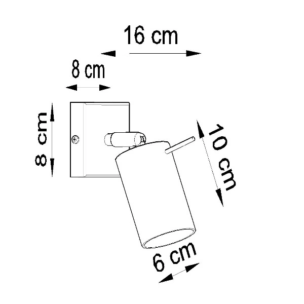 Lampa ma wymiary: długość 8 cm wysokość 8 cm, odległość od ściany 16 cm, wymiar klosza 6/10 cm, Wymiar podsufitki 8/8 cm