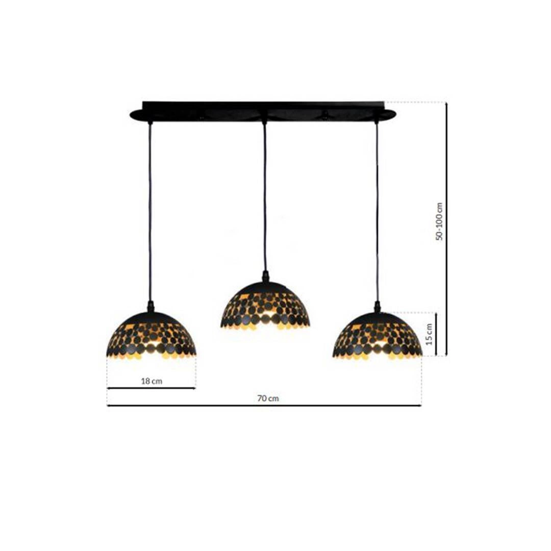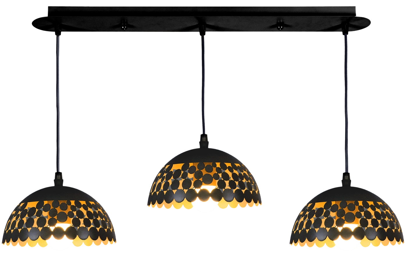 LISA ML6136 to stylowa lampa wisząca z trzema źródłami światła. Wykonana została z wysokiej jakości metalu w kolorze czarnym. Elementem wyróżniającym lampy są czarne ażurowe klosze ze złotym wnętrzem. Oprawa będzie idealnym wyborem do wnętrz urządzonych w nowoczesnym stylu. Doskonale będzie się prezentować w: salonie, jadalni, sypialni, pokoju młodzieżowym, gabinecie, biurze, lokalu, przedpokoju, kuchni. Dużym atutem jest możliwość regulacji wysokości. Wysokość maksymalna lampy to: 100 cm, szerokość 70 cm, głębokość 18 cm. Źródłem światła jest żarówka typu E27 o mocy max 60W w ilości 3 szt.