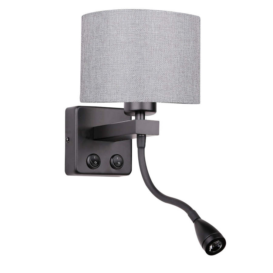POLO 21-75499 to nowoczesna lampa ścienna z dwoma niezależnymi źródłami światła. Podstawę lampy wykonano z wysokiej jakości stali w kolorze czarnym. Abażur jest z szarej tkaniny wzmocnionej od wewnątrz PCV. Lampa w dolnej części posiada elastyczne ramię z dodatkowym źródłem światła, które idealnie sprawdzi się np. do czytania. Wysokość kinkietu to: 44 cm, szerokość 18 cm, głębokość 22 cm. Głównym źródłem światła jest żarówka typu E27 o mocy max 40W w ilości 1 szt. (brak w zestawie). Dodatkowe źródło światła to zintegrowany LED o mocy 2W, ciepłej barwie 3200K i jasności 200lm