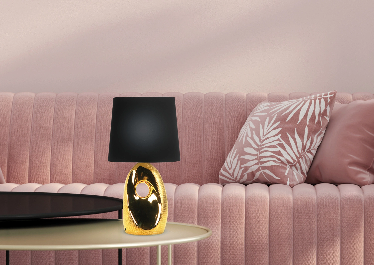 HIERRO 41-79916 to elegancka lampa stołowa z jednym źródłem światła. Podstawę lampy wykonano z ceramiki w kolorze złotym, abażur jest z czarnej tkaniny na nośniku z PCV. Lampa będzie idealnym wyborem do wnętrz urządzonych w stylu klasycznym oraz nowoczesnym. Doskonale będzie się prezentować w: salonie, sypialni, jadalni, pokoju młodzieżowym, gabinecie, lokalu, biurze. Wysokość lampki to: 43 cm, szerokość 23 cm, głębokość 16 cm. Źródłem światła jest żarówka typu E27 o mocy max 60W w ilości 1 szt.