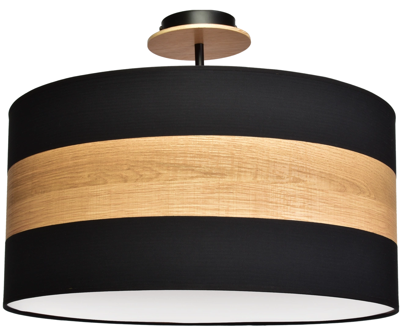 TERRA MLP6291 to nowoczesna lampa sufitowa z trzema źródłami światła. Wykonana została z wysokiej jakości metalu, tkaniny oraz drewna. Elementem wyróżniającym lampy jest czarny abażur w kształcie walca wykonany z tkaniny ze wstawką w kolorze naturalnego drewna. Podsufitka jest w kolorze czarnym z drewnianą wstawką. Lampa będzie idealnym wyborem do wnętrz urządzonych w stylu: klasycznym, nowoczesnym oraz skandynawskim. Doskonale wkomponuje się do: salonu, sypialni, jadalni, pokoju młodzieżowego, gabinetu, lokalu. Wysokość lampy to: 35 cm, szerokość 50 cm, głębokość 50 cm. Klosz ma wysokość 25 cm. Źródłem światła jest żarówka typu E27 o mocy max 60W w ilości 3 szt.