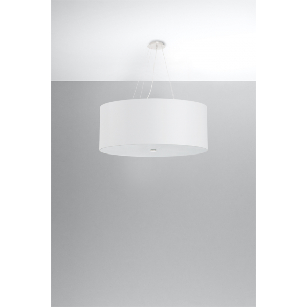 OTTO SL.0789 to nowoczesna lampa wisząca z sześcioma źródłami światła. Oprawa wykonana została z wysokiej jakości szkła, stali oraz tworzywa sztucznego. Lampa posiada biały abażur z tkaniny w kształcie walca zamknięty od dołu szkłem. Będzie idealnym wyborem do wnętrz urządzonych w stylu: nowoczesnym, skandynawskim, industrialnym oraz loftowym. Doskonale będzie się prezentować w: salonie, jadalni, sypialni, pokoju młodzieżowym, gabinecie, biurze, lokalu, kuchni. Dużą zaletą jest możliwość regulacji wysokości. Wysokość maksymalna lampy to: 110 cm, szerokość 70 cm, głębokość 70 cm. Źródłem światła jest żarówka typu E27 o mocy max 60W w ilości 6 szt.