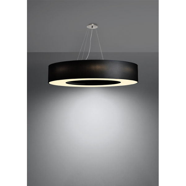 SATURNO SL.0796 to nowoczesna lampa wisząca z ośmioma źródłami światła. Wykonana została z wysokiej jakości tkaniny, stali oraz PVC. Lampa posiada czarny abażur w kształcie koła z pustą przestrzenią w środku. Źródła światła są osłonięte białą membraną, która równomiernie rozprasza światło. Oprawa będzie idealnym wyborem do wnętrz urządzonych w nowoczesnym stylu. Doskonale będzie się prezentować w: salonie, jadalni, sypialni, pokoju młodzieżowym, gabinecie, biurze, lokalu, kuchni. Dużą zaletą jest możliwość regulacji wysokości. Wysokość maksymalna lampy to: 110 cm, szerokość 90 cm, głębokość 90 cm. Źródłem światła jest żarówka typu E27 o mocy max 60W w ilości 8 szt.