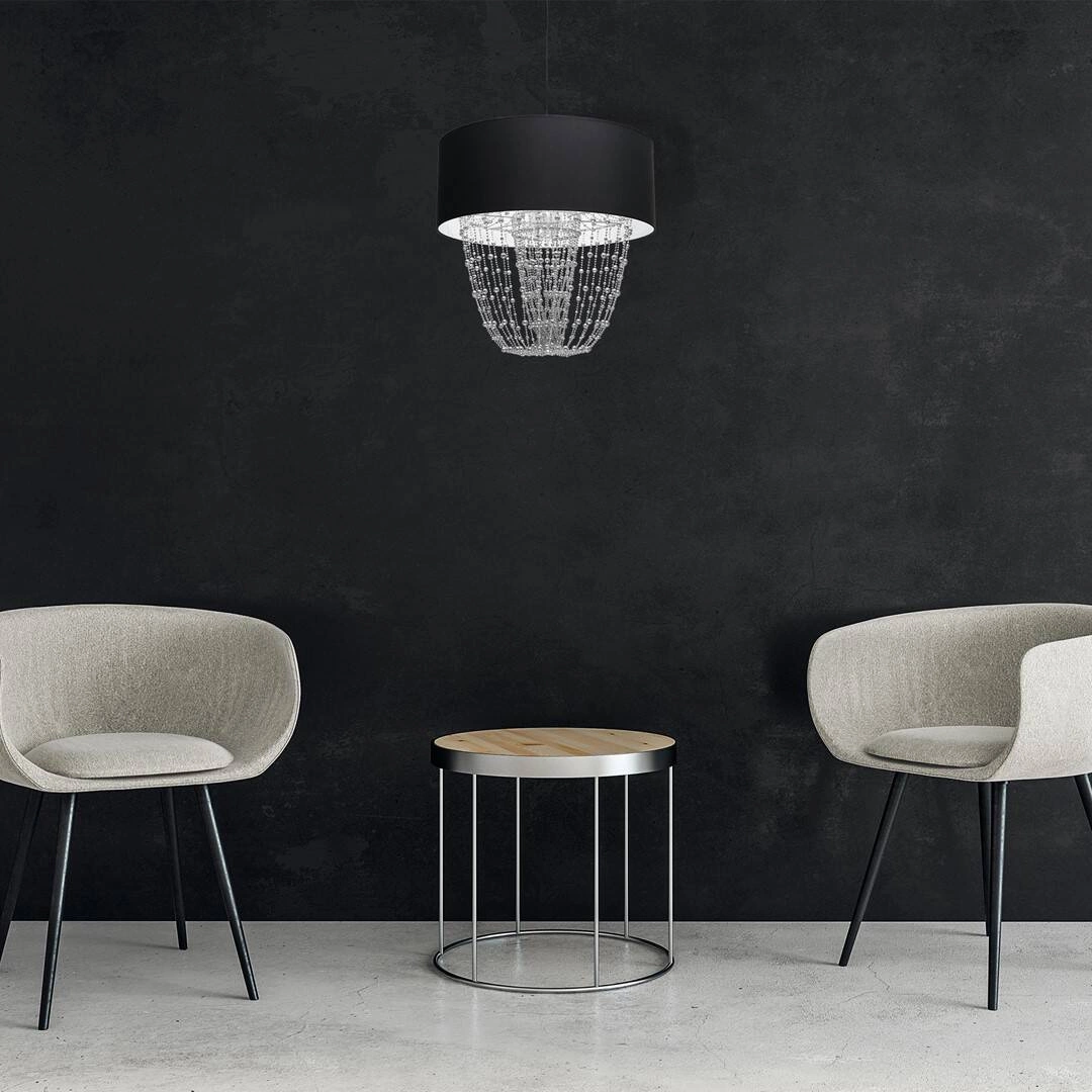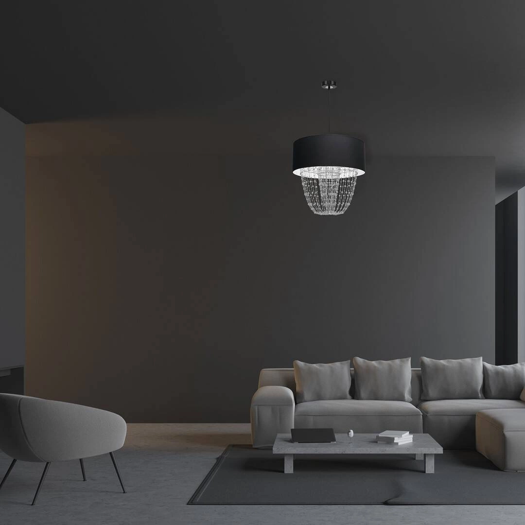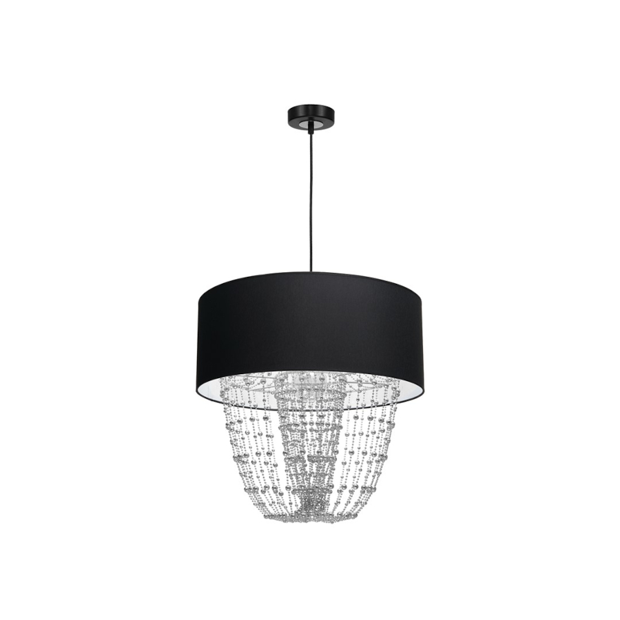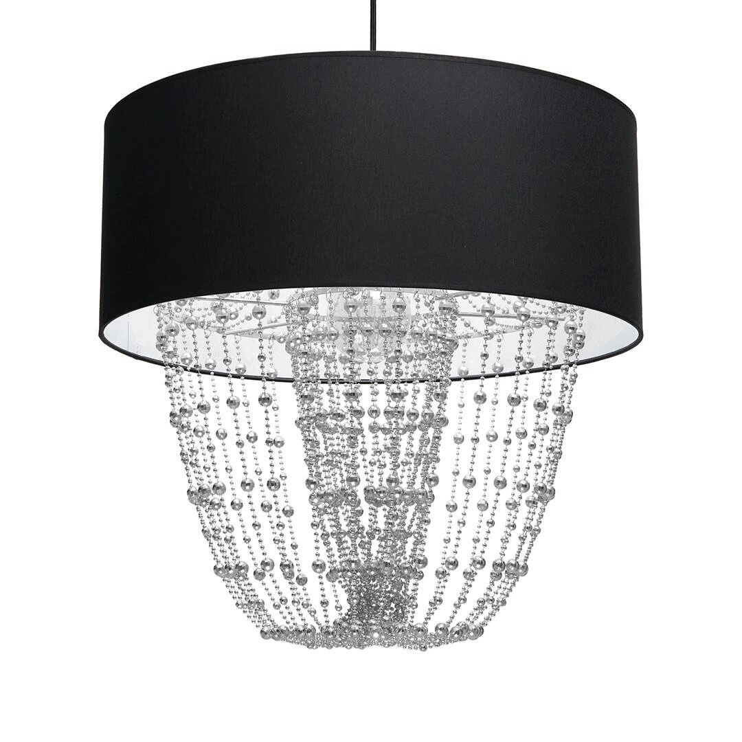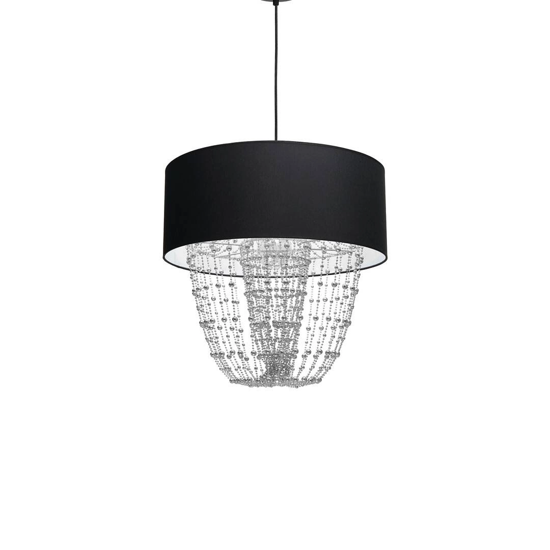 ALMERIA MLP6432 to nowoczesna lampa wisząca z jednym źródłem światła. Lampa posiada klosz w kształcie walca wykonany z tkaniny w kolorze czarnym. Elementem wyróżniającym lampy są zwisające z wnętrza klosza sznury srebrnych korali z tworzywa sztucznego. Podsufitka jest wykonana z wysokiej jakości metalu w kolorze czarnym z chromową wstawką. Lampa będzie doskonałym wyborem do wnętrz urządzonych w stylu nowoczesnym oraz glamour. Idealnie wkomponuje się do: salonu, sypialni, pokoju młodzieżowego, jadalni, lokalu, kuchni. Dużym atutem jest możliwość regulacji wysokości. Wysokość maksymalna lampy to: 100 cm, szerokość 50 cm, głębokość 50 cm. Klosz ma wysokość 50 cm. Źródłem światła jest żarówka typu E27 o mocy max 60W w ilości 1 szt.