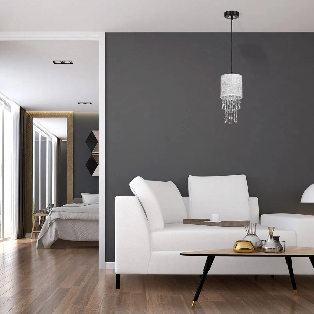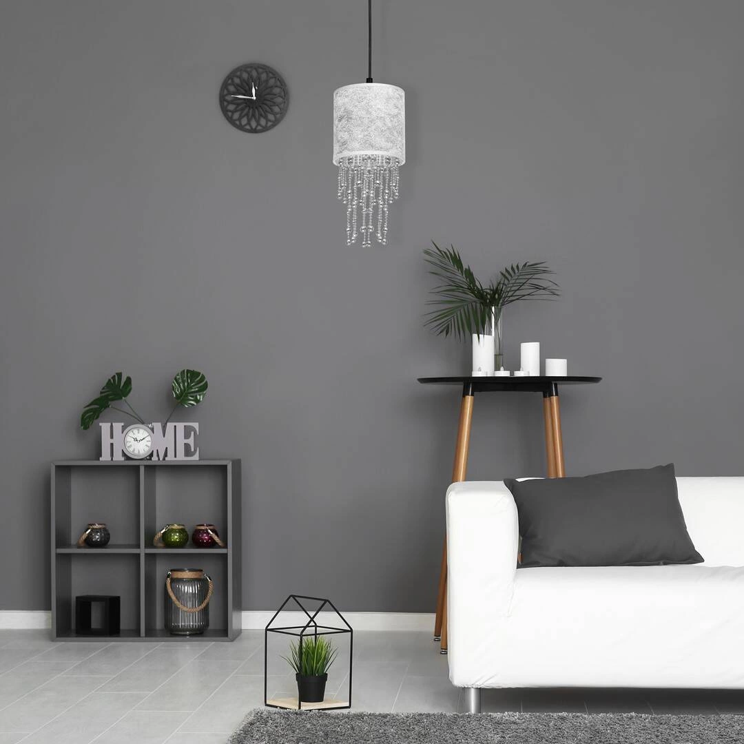 ALMERIA MLP6434 to nowoczesna lampa wisząca z jednym źródłem światła. Lampa posiada klosz w kształcie walca wykonany z tkaniny w kolorze srebrnym na zewnątrz, od środka w kolorze chromu. Elementem wyróżniającym lampy są zwisające z wnętrza klosza sznury srebrnych korali różnej długości z tworzywa sztucznego. Podsufitka jest wykonana z wysokiej jakości metalu w kolorze czarnym z chromową wstawką. Lampa będzie doskonałym wyborem do wnętrz urządzonych w stylu nowoczesnym oraz glamour. Idealnie wkomponuje się do: salonu, sypialni, pokoju młodzieżowego, jadalni, lokalu, kuchni. Dużym atutem jest możliwość regulacji wysokości. Wysokość maksymalna lampy to: 100 cm, szerokość 15 cm, głębokość 15 cm. Klosz ma wysokość 23 cm. Źródłem światła jest żarówka typu E27 o mocy max 60W w ilości 1 szt.