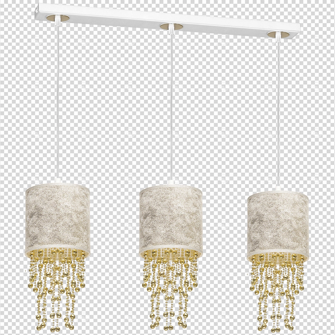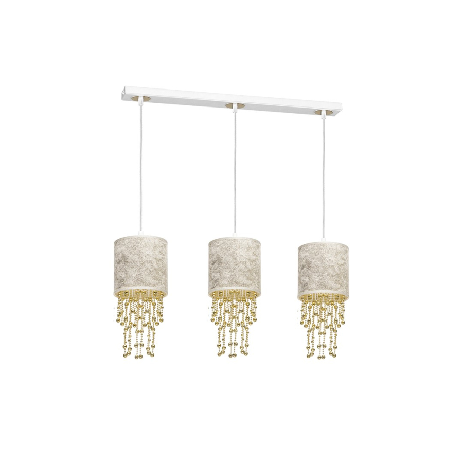 ALMERIA MLP6445 to nowoczesna lampa wisząca z trzema źródłami światła. Lampa posiada trzy klosze w kształcie walca wykonane z tkaniny w kolorze biało-złotym na zewnątrz, od środka w kolorze złotym. Elementem wyróżniającym lampy są zwisające z kloszy sznury złotych korali różnej długości z tworzywa sztucznego. Podsufitka jest wykonana z wysokiej jakości metalu w kolorze białym ze złotymi wstawkami. Lampa będzie doskonałym wyborem do wnętrz urządzonych w stylu nowoczesnym oraz glamour. Idealnie wkomponuje się do: salonu, sypialni, pokoju młodzieżowego, jadalni, lokalu, kuchni. Dużym atutem jest możliwość regulacji wysokości. Wysokość maksymalna lampy to: 100 cm, szerokość 60 cm, głębokość 15 cm. Klosz ma wysokość 23 cm. Źródłem światła jest żarówka typu E27 o mocy max 60W w ilości 3 szt.