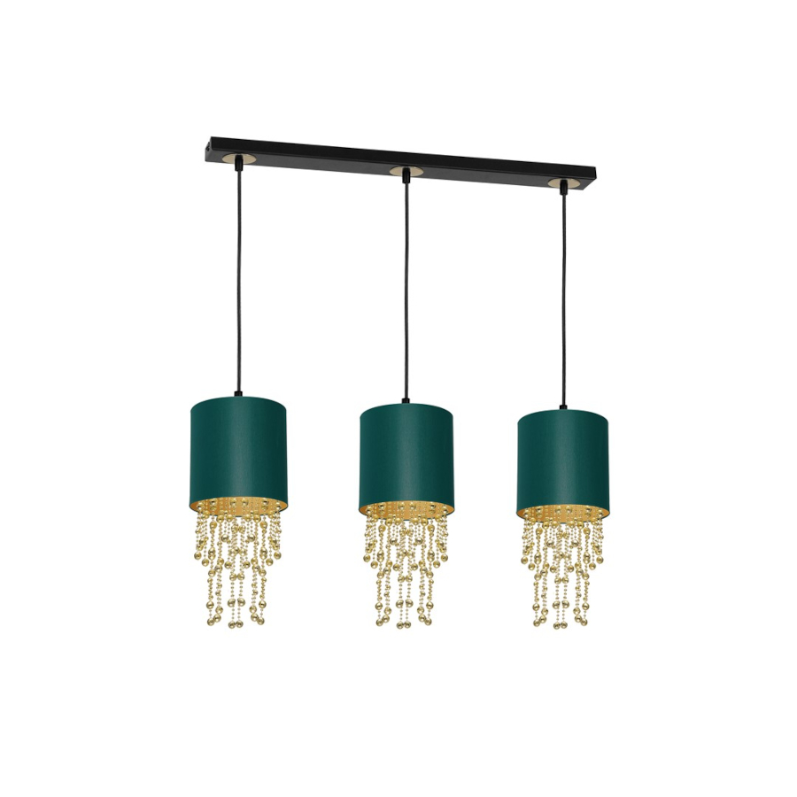 ALMERIA MLP64500 to nowoczesna lampa wisząca z trzema źródłami światła. Lampa posiada trzy klosze w kształcie walca wykonane z tkaniny w kolorze ciemno zielonym na zewnątrz, od środka w kolorze złotym. Elementem wyróżniającym lampy są zwisające z kloszy sznury złotych korali różnej długości z tworzywa sztucznego. Podsufitka jest wykonana z wysokiej jakości metalu w kolorze czarnym ze złotymi wstawkami. Lampa będzie doskonałym wyborem do wnętrz urządzonych w stylu nowoczesnym oraz glamour. Idealnie wkomponuje się do: salonu, sypialni, pokoju młodzieżowego, jadalni, lokalu, kuchni. Dużym atutem jest możliwość regulacji wysokości. Wysokość maksymalna lampy to: 100 cm, szerokość 60 cm, głębokość 15 cm. Klosz ma wysokość 23 cm. Źródłem światła jest żarówka typu E27 o mocy max 60W w ilości 3 szt.