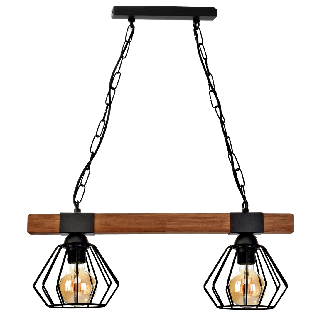 ULF MLP6192 to lampa wisząca z dwoma źródłami światła. Lampa posiada dwa klosze z drutu w kształcie diamentu koloru czarnego osadzone na poziomej drewnianej belce. Belka została zawieszona na stylowych łańcuchach. Kształt kloszy sprawia, że odsłonięte żarówki mogą być elementem ozdobnym lampy dlatego warto wybrać ich dekoracyjny model. Lampa będzie idealnym wyborem do wnętrz urządzonych w stylu industrialnym oraz loftowym. Doskonale wkomponuje się do: salonu, sypialni, kuchni, jadalni, pokoju młodzieżowego lokalu, gabinetu. Dużym atutem lampy jest możliwość regulacji wysokości. Wysokość maksymalna lampy to 90 cm, szerokość 60 cm, głębokość 18 cm. Klosz ma wysokość 16 cm. Źródłem światła jest żarówka typu E27 o mocy max 60W w ilości 2 szt.