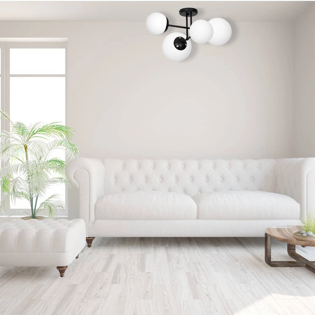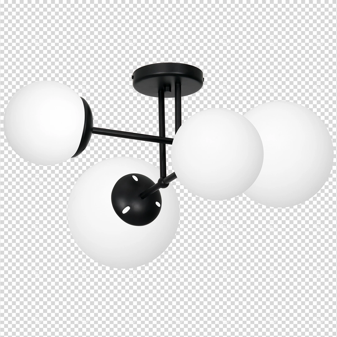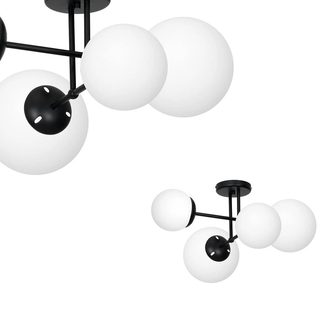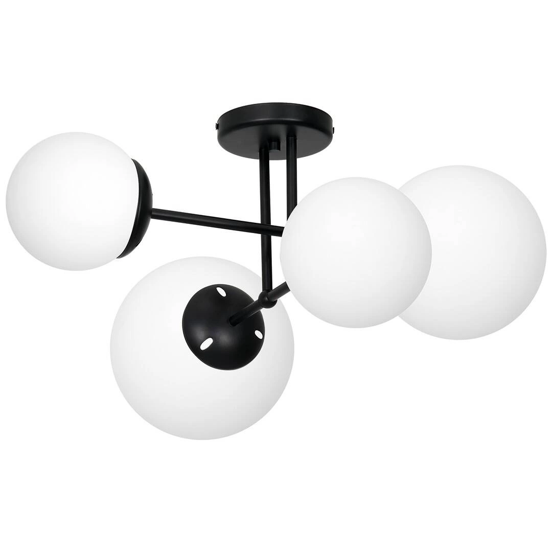 LIMA MLP6527 nowoczesna lampa sufitowa z czterema źródłami światła. Korpus lampy wykonany jest z wysokiej jakości metalu w kolorze czarnym. Lampa posiada cztery białe szklane klosze w kształcie kul osadzone na poziomych ramionach. Połączenie koloru białego z czarnym sprawia, że jest ona bardzo elegancka i efektowna. Lampa jest idealnym wyborem do nowoczesnych wnętrz. Idealnie wkomponuje się do salonu, gabinetu, biura, sypialni, jadalni, pokoju młodzieżowego. Wysokość lampy to 30 cm, szerokość 56 cm, głębokość 56 cm. Klosze mają wysokość 14 cm, 17 cm i 20 cm. Źródłem światła jest żarówka typu E14 o mocy max 40W w ilości 4 szt.