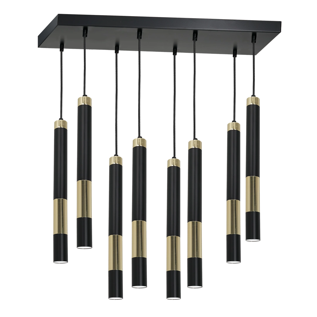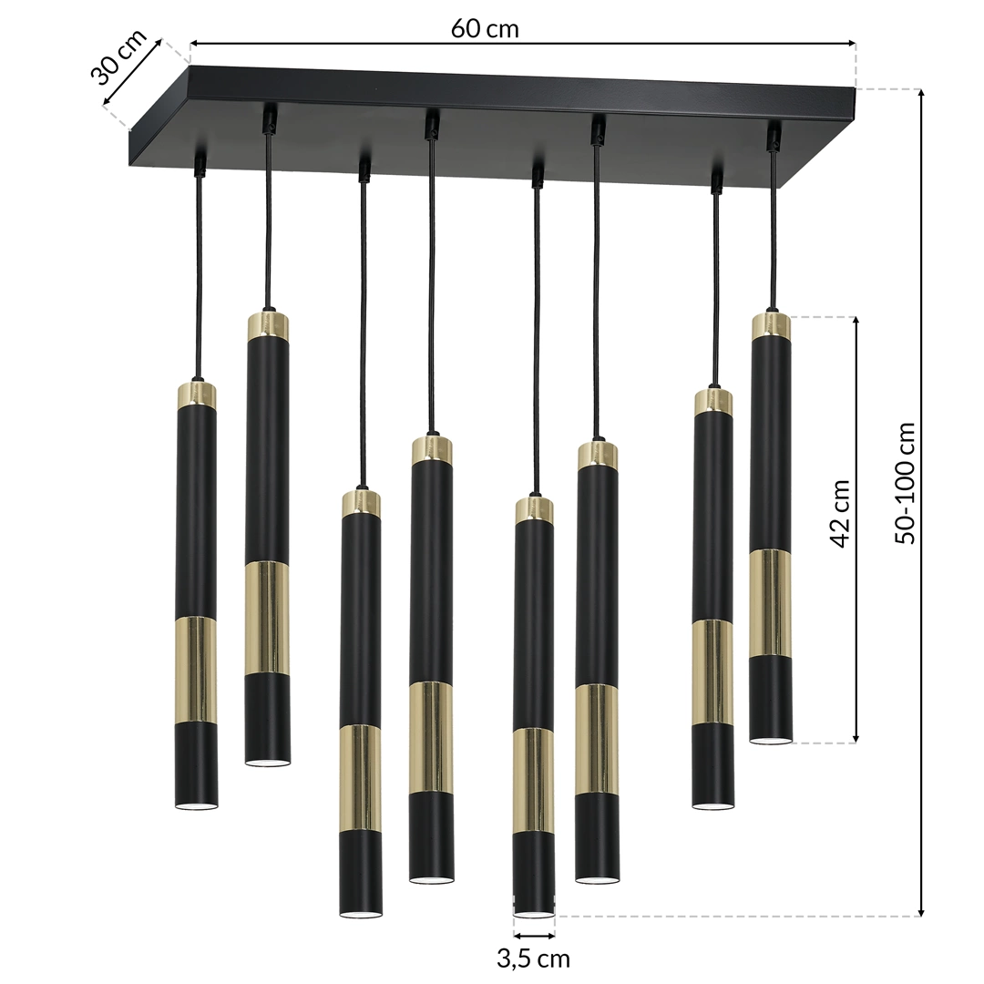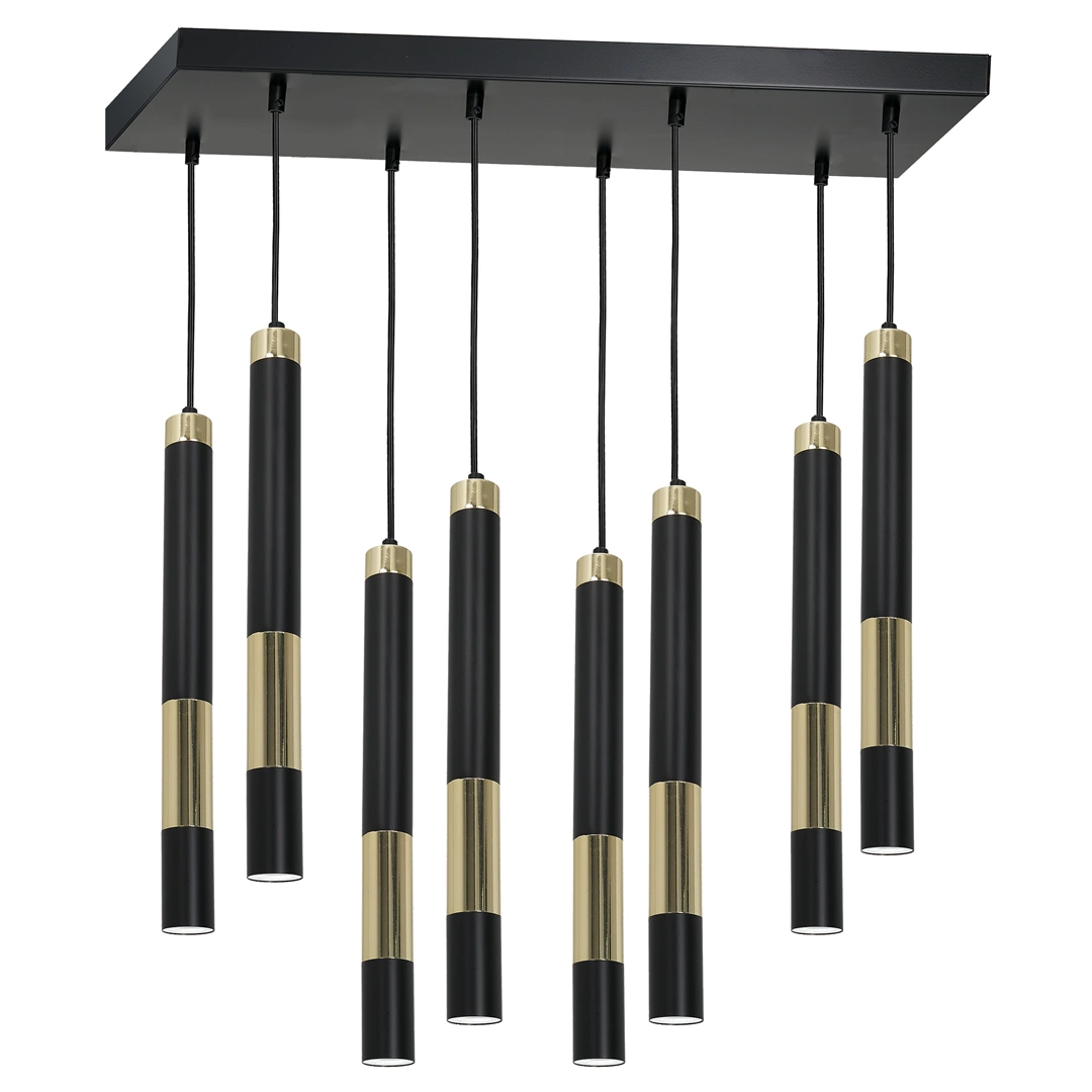 DALLAS GOLD MLP6551 to nowoczesna lampa wisząca z ośmioma źródłami światła. Wykonana została z wysokiej jakości metalu w kolorze czarnym. Lampa posiada osiem zwisających kloszy w kształcie walca przypominających sople. Elementem wyróżniającym lampy są złote wstawki na kloszach i na podsufitce. Lampa będzie doskonałym wyborem do nowoczesnych wnętrz. Doskonale będzie się prezentować w każdym pomieszczeniu. Dużą zaletą lampy jest możliwość regulacji wysokości. Wysokość maksymalna lampy to: 100 cm, szerokość 60 cm, głębokość 30 cm. Klosz ma wysokość 42 cm i średnicę 3,5 cm. Źródłem światła jest żarówka typu GU10 o mocy max 3W LED 2400lm 3000K w ilości 8 szt. Żarówki są dołączone do lampy.