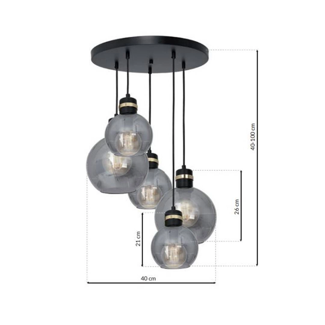 OMEGA MLP6534 to nowoczesna lampa wisząca z pięcioma źródłami światła. Wykonana jest z wysokiej jakości metalu i szkła. Lampa posiada pięć pięknych kloszy z dymionego szkła w kształcie kul. Wyróżniającym się elementem ozdobnym są złote wstawki nad kloszami, co w połączeniu z czarnym kolorem nadaje klasy i elegancji. Lampa będzie idealnym wyborem do nowoczesnych, klasycznych oraz minimalistycznych wnętrz. Doskonale wkomponuje się do: salonu, jadalni, sypialni, pokoju młodzieżowego, gabinetu. Dużym atutem jest możliwość regulacji wysokości. Wysokość maksymalna to: 100 cm, szerokość 40 cm, głębokość 40 cm. Źródłem światła jest żarówka typu E27 o mocy max 60W w ilości 5 szt.