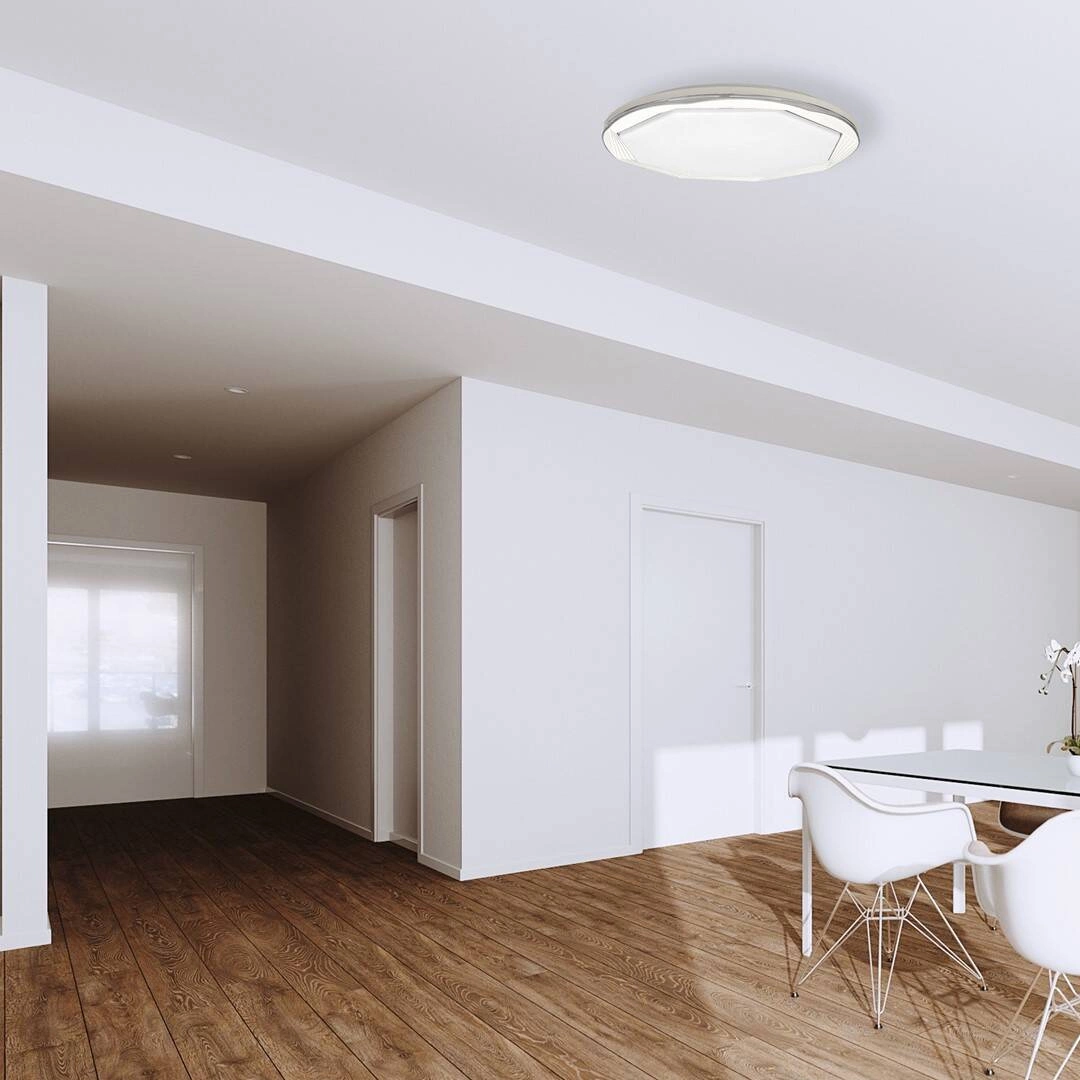 OPTIMA ML6400 to nowoczesna lampa sufitowa, która doskonale będzie się prezentować w każdym pomieszczeniu. Wykonana została z metalu i tworzywa sztucznego w kolorze białym. Plafon ma okrągły kształt, a osłona źródła światła jest w kształcie wielościanu. Elementem wyróżniającym lampy są efektowne zdobienia na obudowie. Lampa wyposażona jest w pilot, który umożliwia między innymi ściemnianie, a także regulację barwy światła- od zimnej, przez naturalną aż po ciepłą. Wysokość lampy to: 6 cm, a średnica 48 cm. W lampie zastosowano źródło światła LED o mocy 52W, zmiennej barwie światła 3000K-6000K i jasności 3640lm.