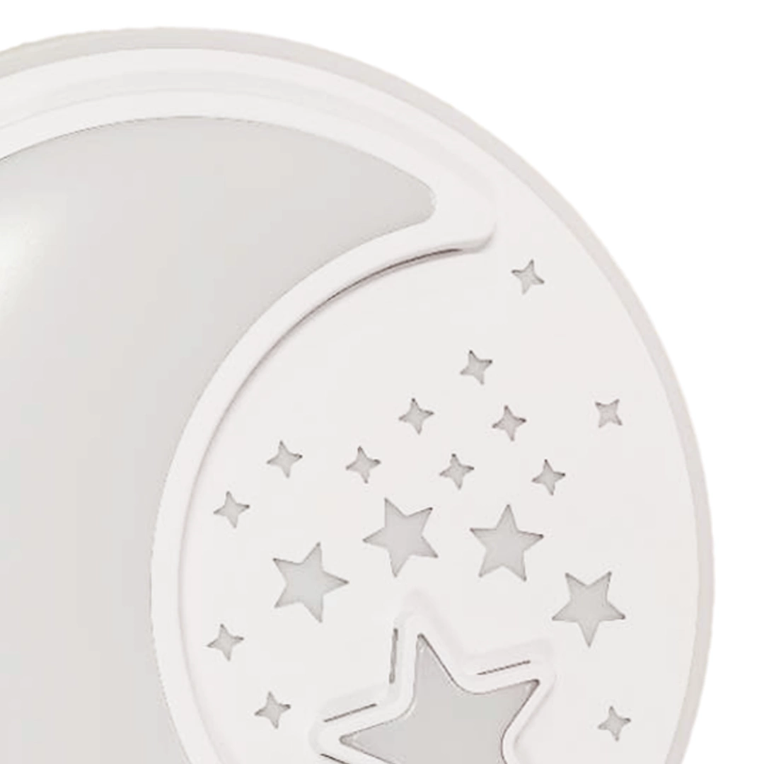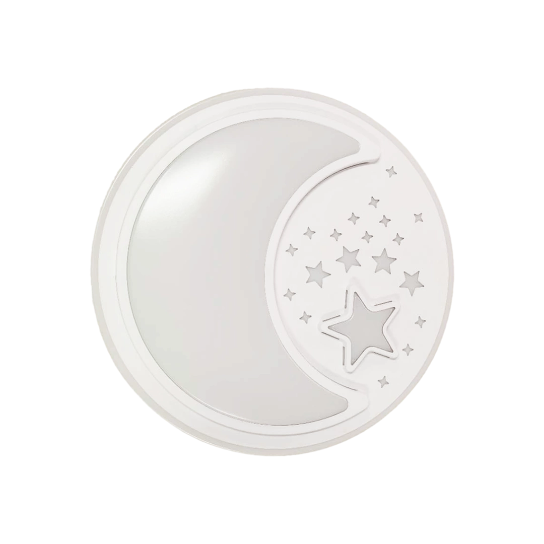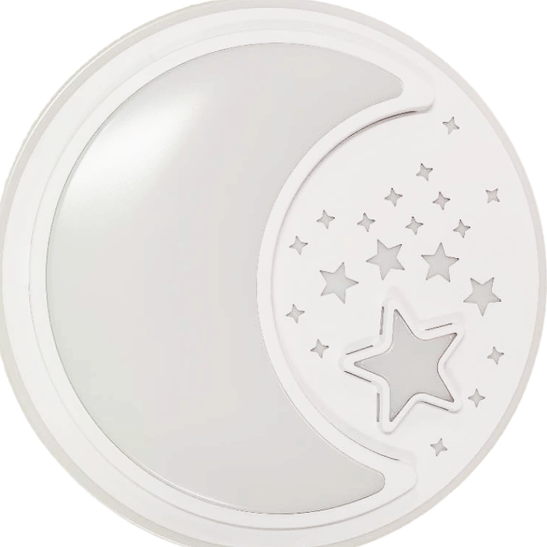 NOTTE WHITE MLP6182 to nowoczesny plafon, który idealnie wkomponuje się do dziecięcego pokoju. Wykonany został z wysokiej jakości metalu i tworzywa sztucznego w kolorze białym. Elementem wyróżniającym lampy jest okrągły klosz ozdobiony motywem gwiazd i księżyca. Plafon wyposażony jest w pilot zdalnego sterownia, który umożliwia miedzy innymi regulację natężenia oraz barwy światła. Wysokość lampy to: 8 cm, średnica 48 cm. W lampie zastosowano źródło światła LED o mocy 40W, zmiennej barwie światła 3000K-6000K i jasności 2800lm.