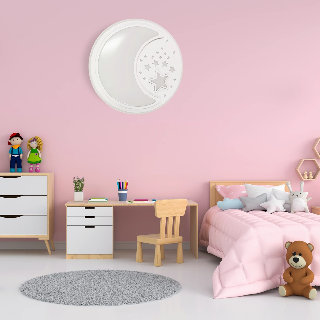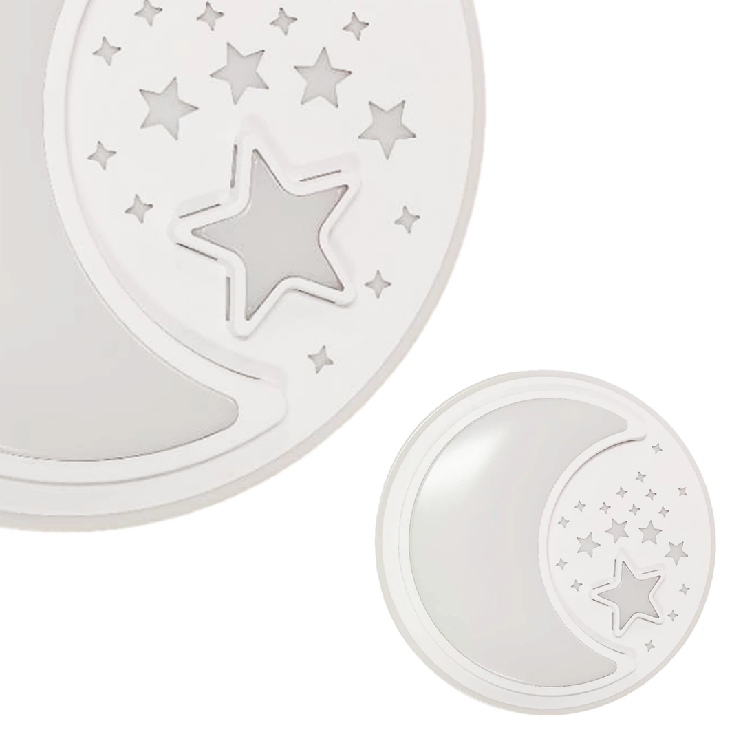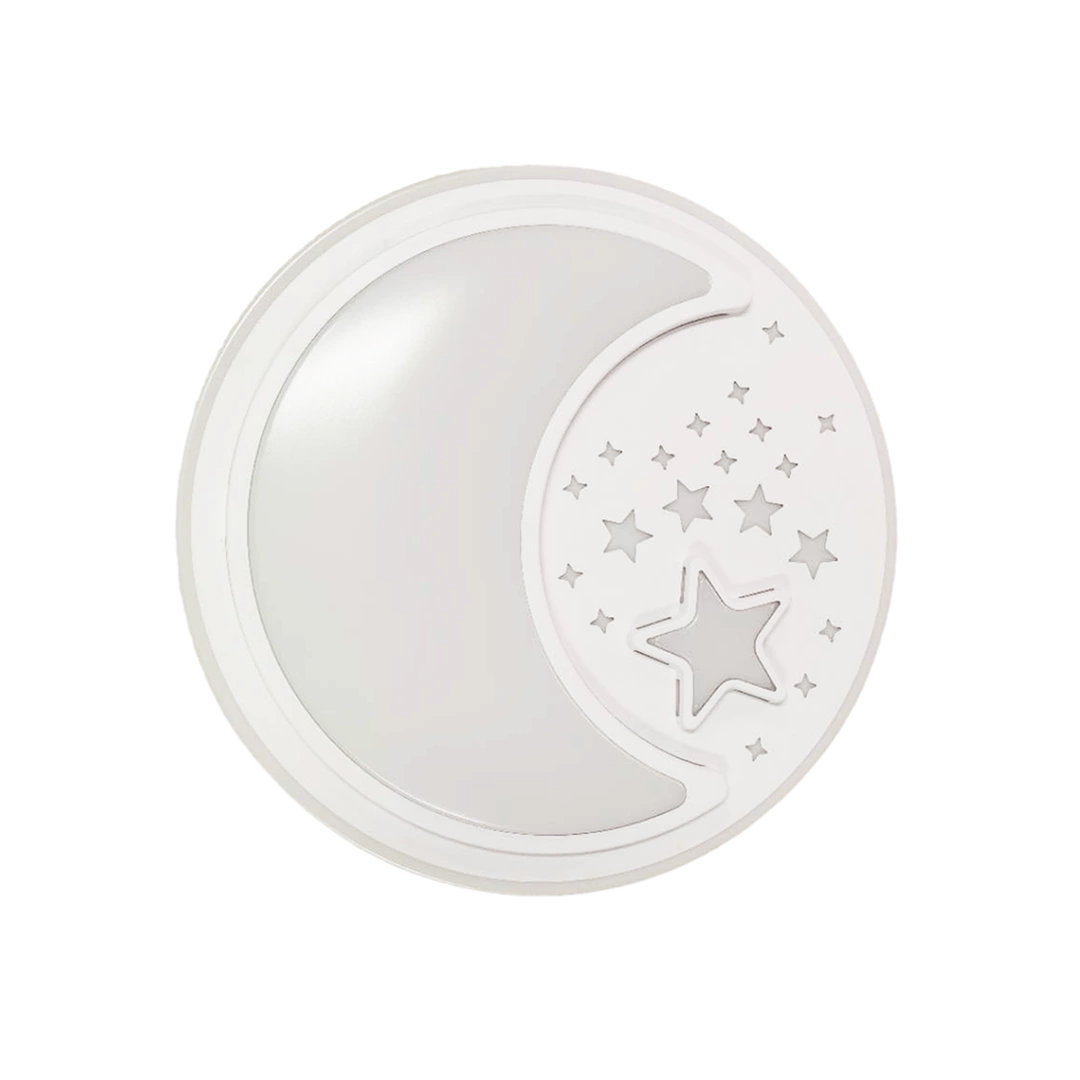 NOTTE WHITE MLP6182 to nowoczesny plafon, który idealnie wkomponuje się do dziecięcego pokoju. Wykonany został z wysokiej jakości metalu i tworzywa sztucznego w kolorze białym. Elementem wyróżniającym lampy jest okrągły klosz ozdobiony motywem gwiazd i księżyca. Plafon wyposażony jest w pilot zdalnego sterownia, który umożliwia miedzy innymi regulację natężenia oraz barwy światła. Wysokość lampy to: 8 cm, średnica 48 cm. W lampie zastosowano źródło światła LED o mocy 40W, zmiennej barwie światła 3000K-6000K i jasności 2800lm.
