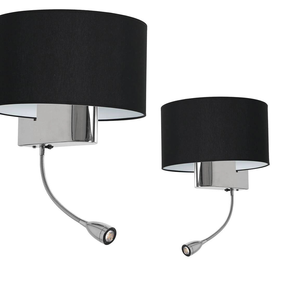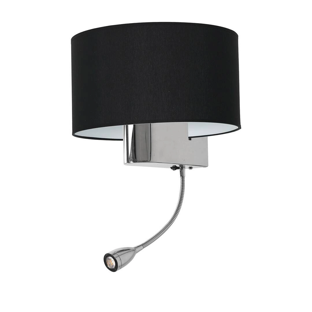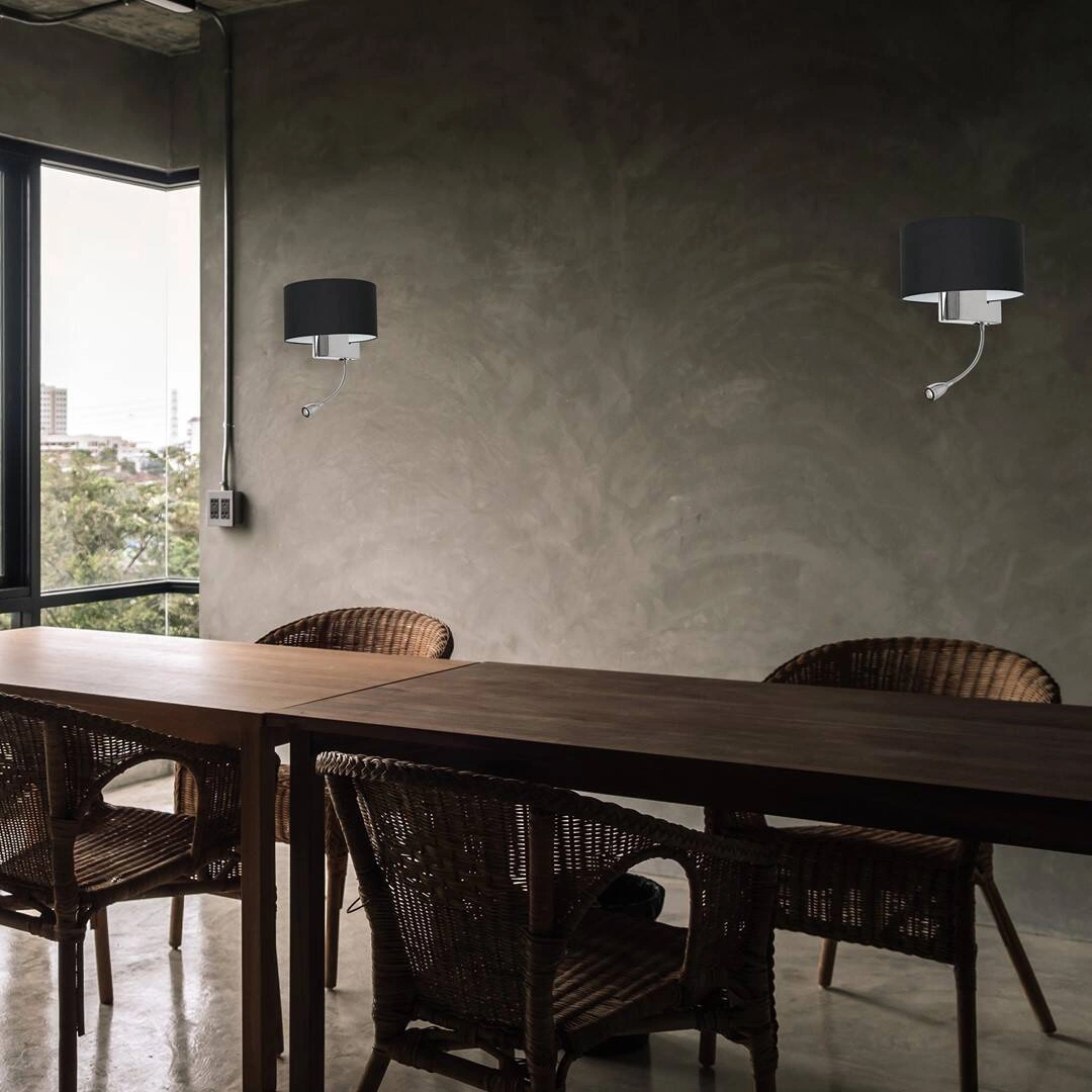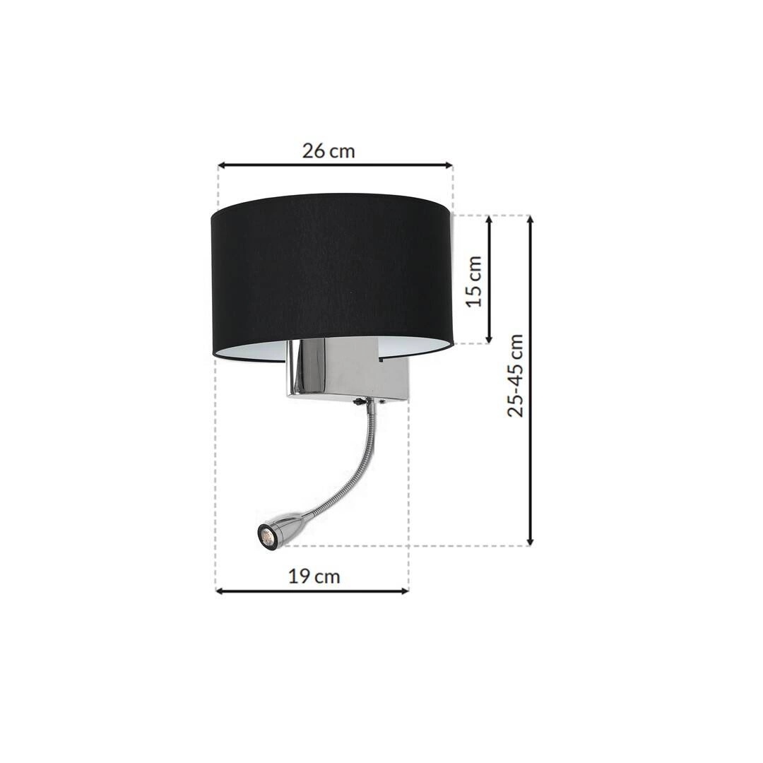 CASINO ML6378 to nowoczesna lampa ścienna z dwoma źródłami światła. Korpus lampy wykonano z wysokiej jakości metalu w kolorze chromu. Abażur ma kształt walca, jest wykonany z tkaniny w kolorze czarnym na zewnątrz, od środka jest biały. Kinkiet posiada dodatkową, niezwykle praktyczną lampkę LED na elastycznym ramieniu. Lampa będzie idealnym wyborem do klasycznych oraz nowoczesnych wnętrz. Doskonale wpasuje się do: salonu, sypialni, jadalni, pokoju młodzieżowego, gabinetu, lokalu, korytarza. Może stanowić uzupełnienie lamp sufitowych tej serii jak i być oddzielnym elementem wystroju wnętrza. Wysokość kinkietu to: 19 cm, szerokość 26 cm, głębokość 19 cm. Klosz ma wysokość 15 cm. Źródłem światła jest żarówka typu E27 o mocy max 60W w ilości 1 szt. oraz LED 1W 90lm 4000K (wbudowana).