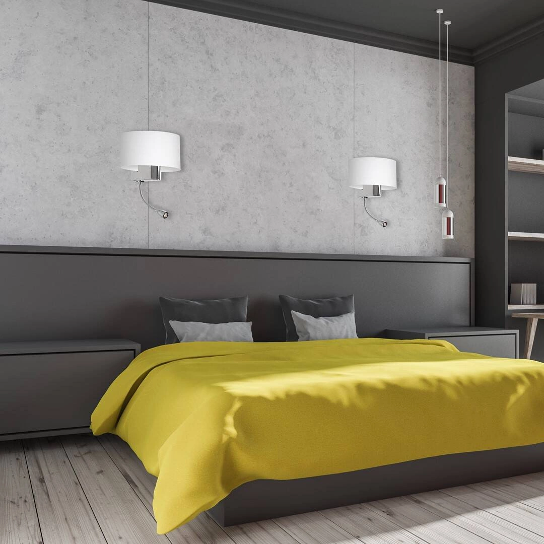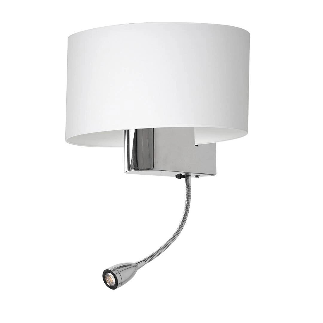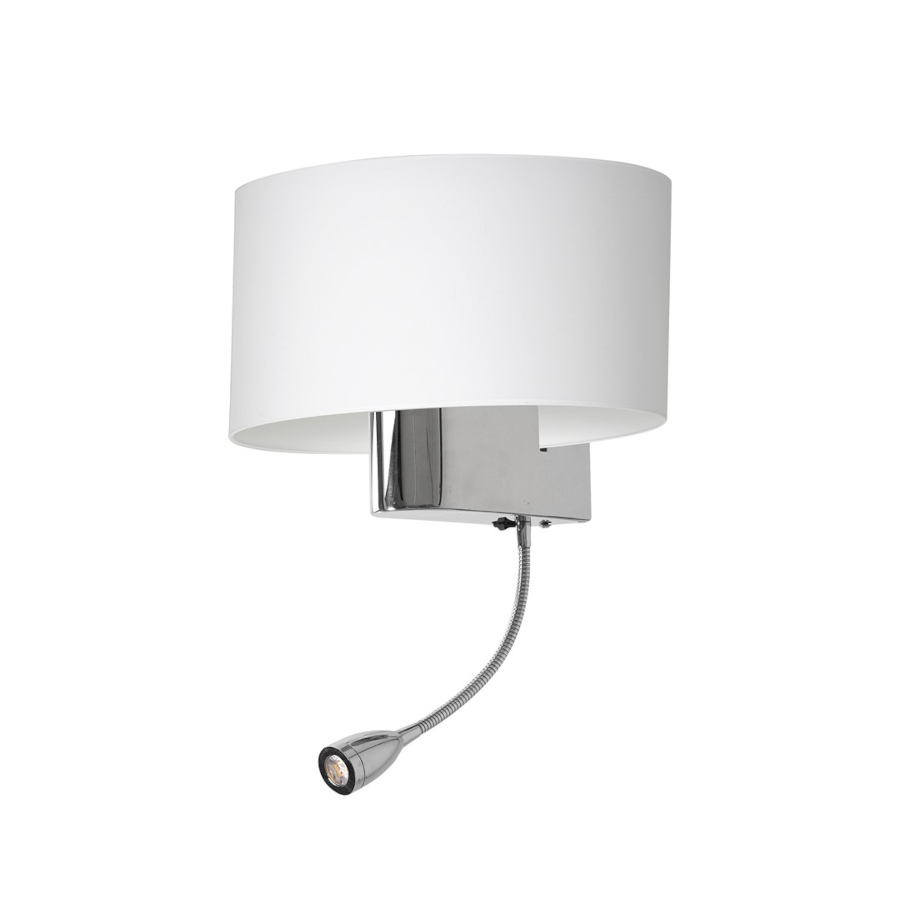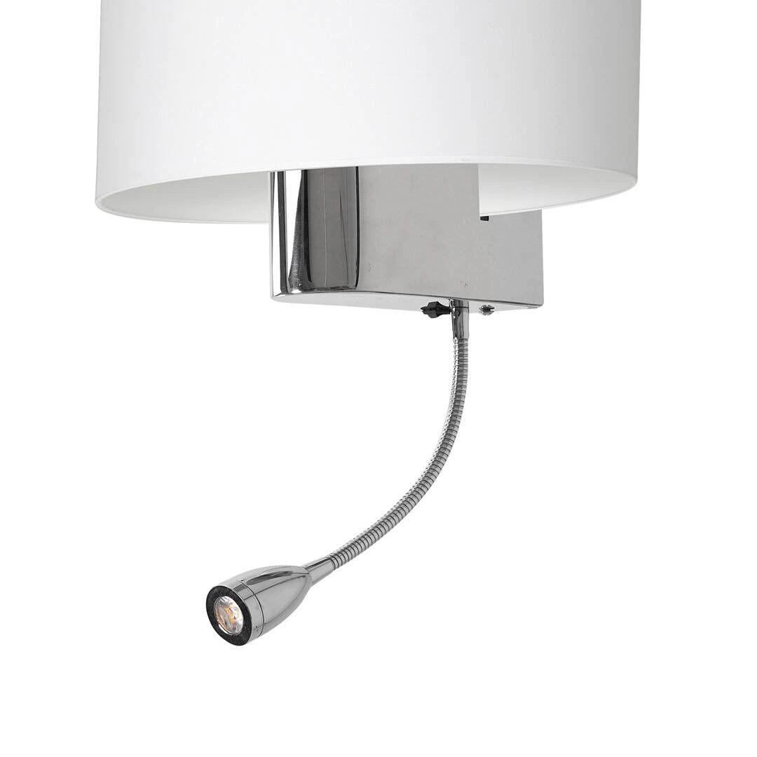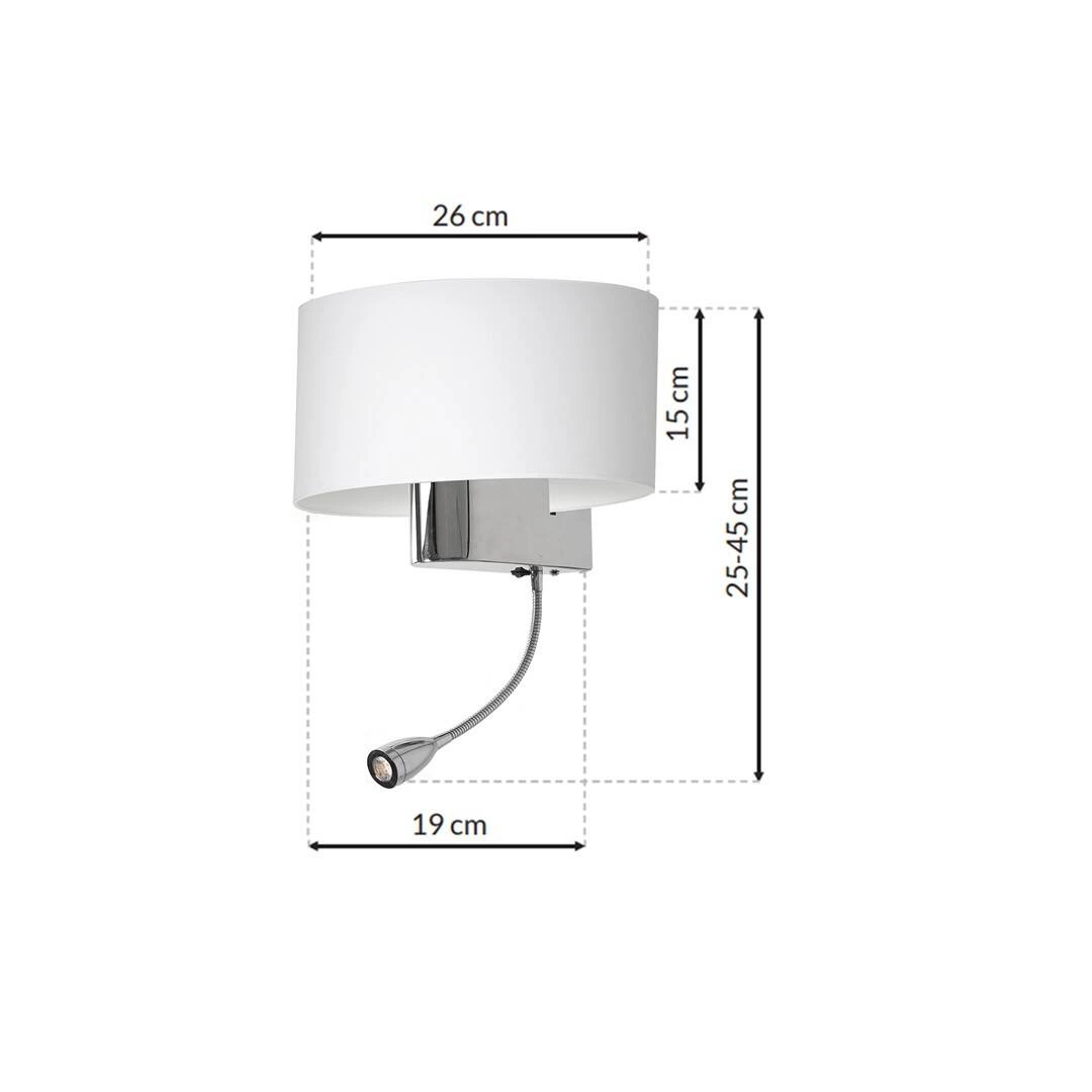 CASINO ML6372 to nowoczesna lampa ścienna z dwoma źródłami światła. Korpus lampy wykonano z wysokiej jakości metalu w kolorze chromu. Abażur ma kształt walca, jest wykonany z tkaniny w kolorze białym. Kinkiet posiada dodatkową, niezwykle praktyczną lampkę LED na elastycznym ramieniu. Lampa będzie idealnym wyborem do klasycznych oraz nowoczesnych wnętrz. Doskonale wpasuje się do: salonu, sypialni, jadalni, pokoju młodzieżowego, gabinetu, lokalu, korytarza. Może stanowić uzupełnienie lamp sufitowych tej serii jak i być oddzielnym elementem wystroju wnętrza. Wysokość kinkietu to: 19 cm, szerokość 26 cm, głębokość 19 cm. Klosz ma wysokość 15 cm. Źródłem światła jest żarówka typu E27 o mocy max 60W w ilości 1 szt. oraz LED 1W 90lm 4000K (wbudowana).