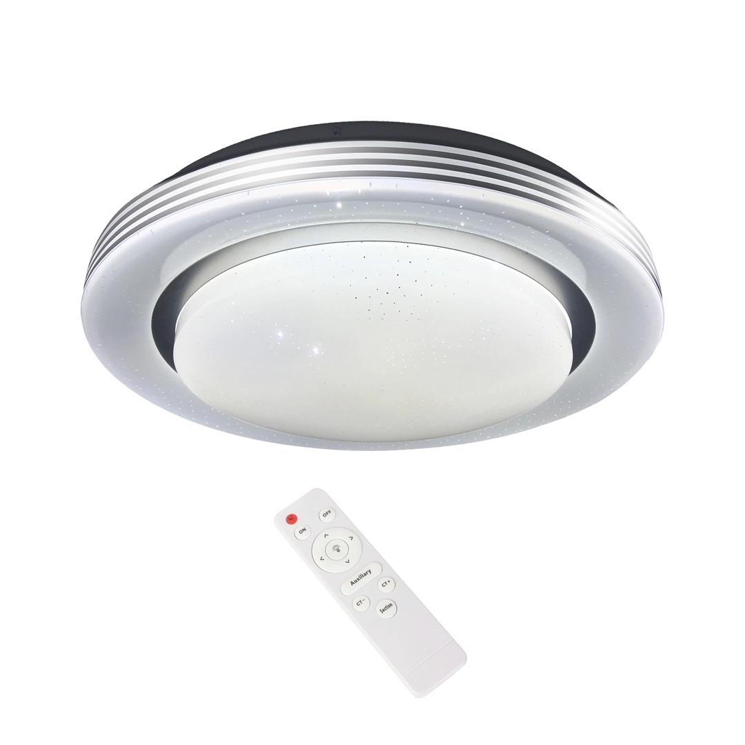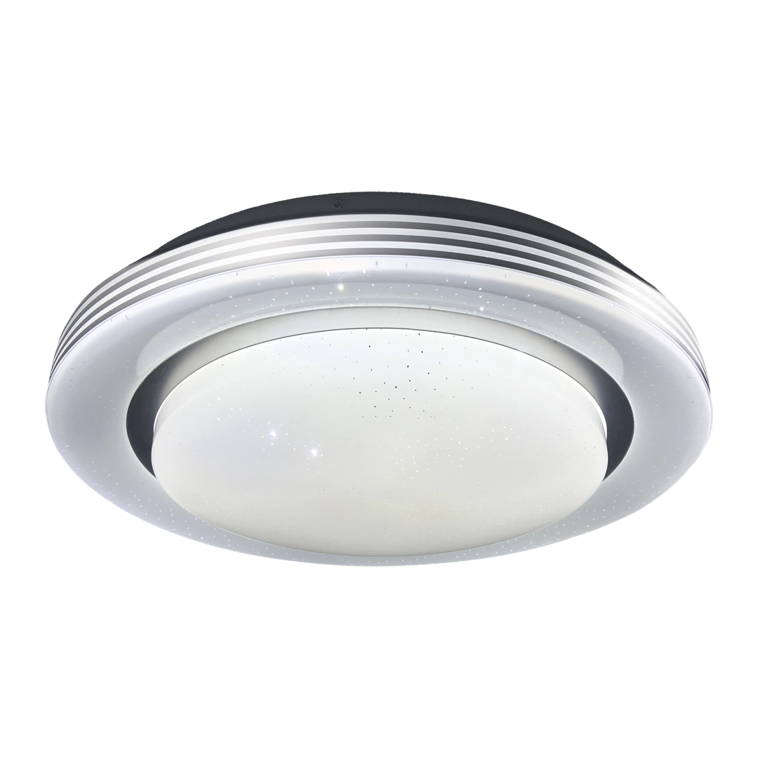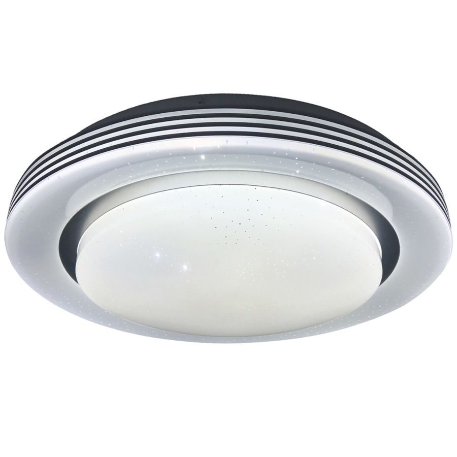 KELLY ML6407 to nowoczesna lampa sufitowa z jednym źródłem światła. Wykonana została z wysokiej jakości metalu i tworzywa sztucznego. Oprawa ma kształt koła w białym kolorze ozdobionego na brzegach czarnymi liniami. Plafon wyposażony jest w pilot, który umożliwia miedzy innym regulację natężenia oraz zmianę barwy światła. Dodatkową zaletą lampy jest funkcja tzw. efektu gwieździstego nieba. Lampa doskonale będzie się prezentować w: salonie, sypialni, pokoju młodzieżowym. Wysokość lampy to: 8 cm, a średnica 38 cm. W lampie zastosowano wymienny moduł LED o mocy 24W, zmiennej barwie światła 3000K-6000K i jasności 1680lm.
