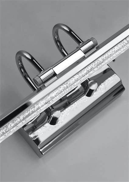 stylowa kombinacja chromu z transparentnym akrylem; wewnątrz akrylowego klosza dekoracyjne pęcherzyki powietrza, szczególnie wyraziste po zaświeceniu oprawy, imponująco odbijąjące się w lustrzanej powierzchni chromowej podstawy; ruchome połączenie ramienia z kloszem umożliwia regulację kąta padania światła; idealna propozycja nad lustro