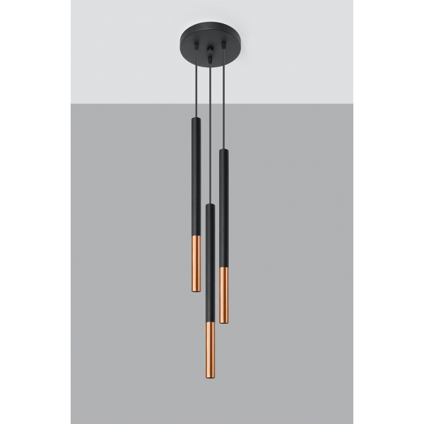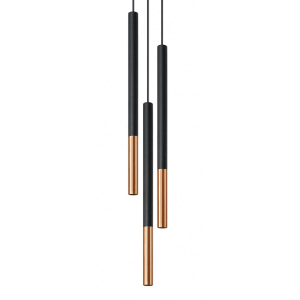 MOZAICA 3P SL.0890 to nowoczesna lampa wisząca z trzema źródłami światła. Wykonana została z wysokiej jakości stali w kolorze czarno-miedzianym. Lampa posiada trzy klosze w kształcie tuby zwisające z okrągłej rozety. Oprawa będzie idealnym wyborem do wnętrz urządzonych w nowoczesnym stylu. Doskonale będzie się prezentować w: salonie, jadalni, sypialni, pokoju młodzieżowym, gabinecie, biurze, lokalu. Dużą zaletą jest możliwość regulacji wysokości. Wysokość maksymalna lampy to: 100 cm, szerokość 20 cm, głębokość 20 cm. Źródłem światła jest żarówka typu G9 o mocy max 40W w ilości 3 szt.