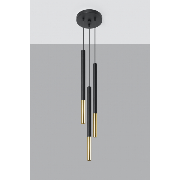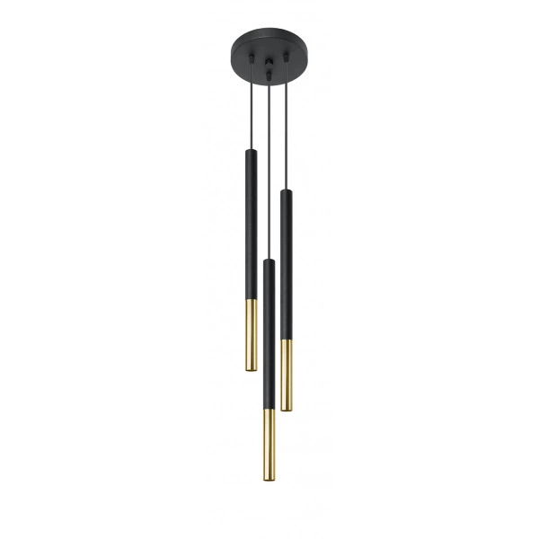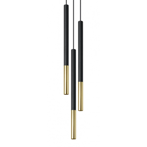 MOZAICA 3P SL.0893 to nowoczesna lampa wisząca z trzema źródłami światła. Wykonana została z wysokiej jakości stali w kolorze czarno-złotym. Lampa posiada trzy klosze w kształcie tuby zwisające z okrągłej rozety. Oprawa będzie idealnym wyborem do wnętrz urządzonych w nowoczesnym stylu. Doskonale będzie się prezentować w: salonie, jadalni, sypialni, pokoju młodzieżowym, gabinecie, biurze, lokalu. Dużą zaletą jest możliwość regulacji wysokości. Wysokość maksymalna lampy to: 100 cm, szerokość 20 cm, głębokość 20 cm. Źródłem światła jest żarówka typu G9 o mocy max 40W w ilości 3 szt.