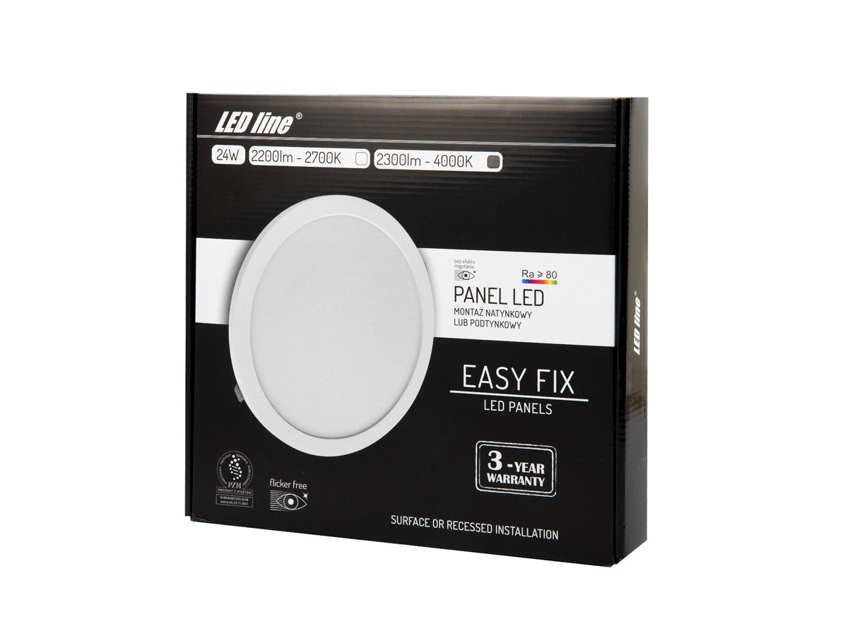 Panele LED line® gwarantują najwyższe parametry świetlne: szeroki kąt świecenia 120°, czyste i przyjemne światło o wysokim współczynniku oddawania barw RA>80 to tylko niektóre z nich. Bardzo wąska obudowa (13 mm) sprawia, że panel wygląda bardzo estetycznie na sufitach. Okrągły panel LED line® EasyFix świetnie sprawdzi się zarówno w Twoim domu (w salonie, jadalni, sypialni), jak też w biurze, restauracji czy hotelu.