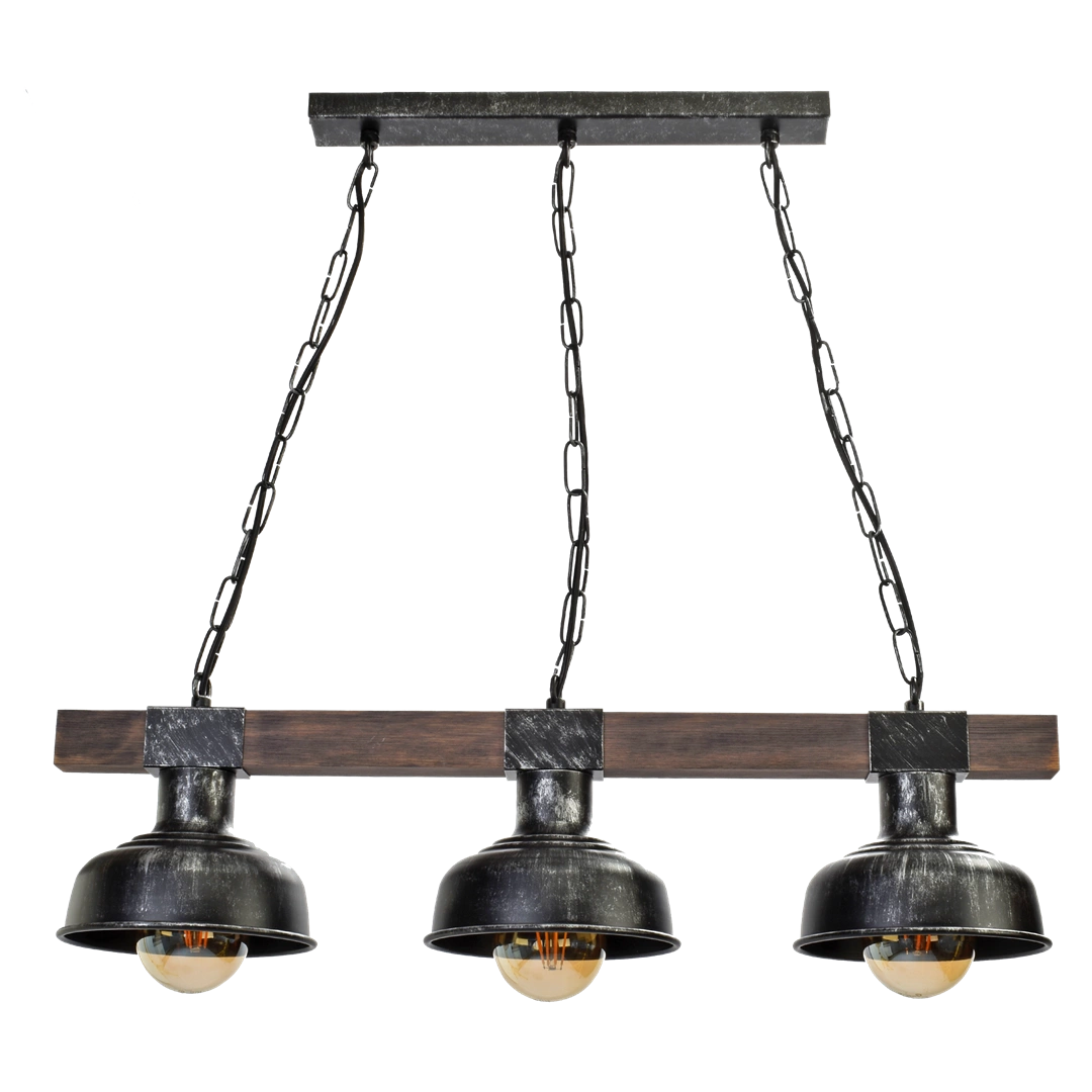FARO MLP6243 to lampa wisząca z trzema źródłami światła. Lampa posiada trzy metalowe klosze koloru czarnego osadzone na poziomej drewnianej belce. Belka została zawieszona na stylowych łańcuchach. Kształt kloszy sprawia, że odsłonięte żarówki mogą być elementem ozdobnym lampy dlatego warto wybrać ich dekoracyjny model. Lampa będzie idealnym wyborem do wnętrz urządzonych w stylu industrialnym oraz rustykalnym. Doskonale wkomponuje się do: salonu, sypialni, kuchni, jadalni, pokoju młodzieżowego lokalu, gabinetu. Dużym atutem lampy jest możliwość regulacji wysokości. Wysokość maksymalna lampy to 90 cm, szerokość 72 cm, głębokość 18 cm. Klosz ma wysokość 12 cm. Źródłem światła jest żarówka typu E27 o mocy max 60W w ilości 3 szt.