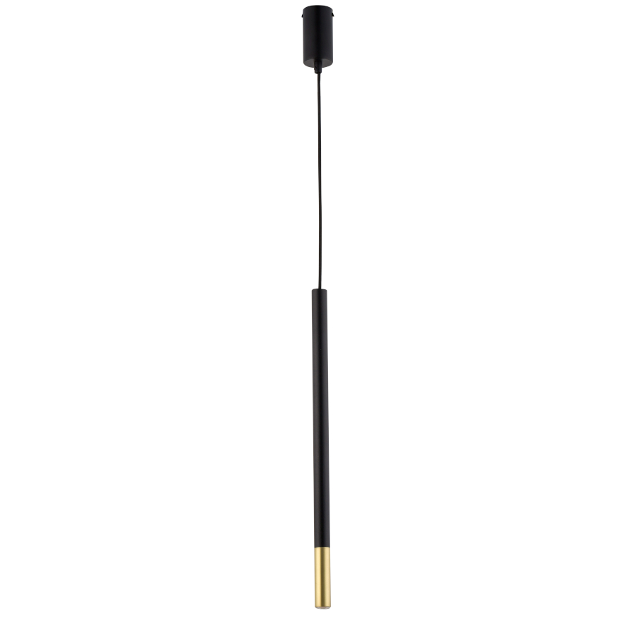 Nowoczesna lampa wisząca SOPEL DUE 1 to wisząca lampa z 1 źródłem światła. Wykonana jest ze stali lakierowanej w kolorze czarnym oraz zakończeniami mosiężnymi w kolorze złotym. Wiszące czarne sople wykończone zostały złotymi elementami nadającymi wyjątkowości. Połączenie to sprawia, że wnętrze nabiera niezwykłego wyglądu. Lampa nada charakteru wnętrzom minimalistycznym jak i klasycznym w jadalni, salonie, sypialni, biurze. Znakomitą aranżację wnętrza można uzyskać poprzez zestawienie pojedynczych sopli czarnego koloru. Kontrastowe zestawienie czarnych i białych sopli wprowadzi wyrazisty rys do każdej aranżacji. Maksymalna wysokość lampy 100 cm, szerokość 5 cm. Wysokość sopla 50 cm, a średnica 2,5 cm. Źródłem światła jest żarówka typu G9 w ilości 1 szt. o mocy max. 25W